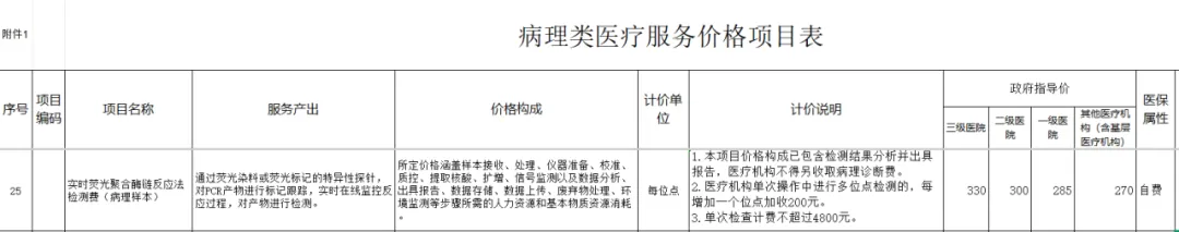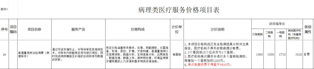 7.分子病理:高通量测序法(NGS)检测费,封顶费用10000元(每增加一个面板,按照75%加收,换算即总共8个面板及以上),实时荧光聚合酶链反应法(PCR)检测费,封顶费用4686元(每增加一个位点,按照60%加收,换算即总共23个位点及以上)。
