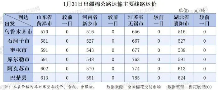 2026年1月31日,出疆棉公路运输价格指数为0.1685元/吨·公里,环比持平。今日,运输需求和运力资源同步减少,指数无变化。预计短期内,运价指数或将呈现整体相对平稳态势。