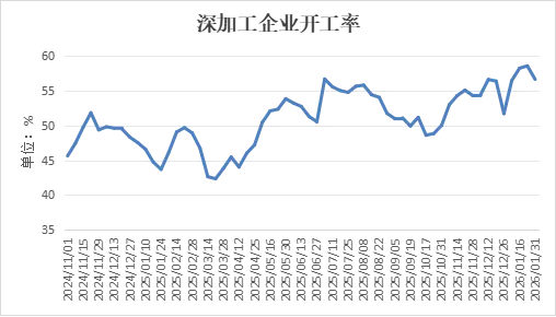随着春节临近,下游企业备货需求本应支撑市场,但今年备货力度明显弱于往年。一方面因深加工企业普遍对后市持谨慎态度;另一方面则因终端行业(如钢铁、建材)需求未现改善,限制了备货规模。这种“弱备货”特征加剧了价格的短期下行压力。