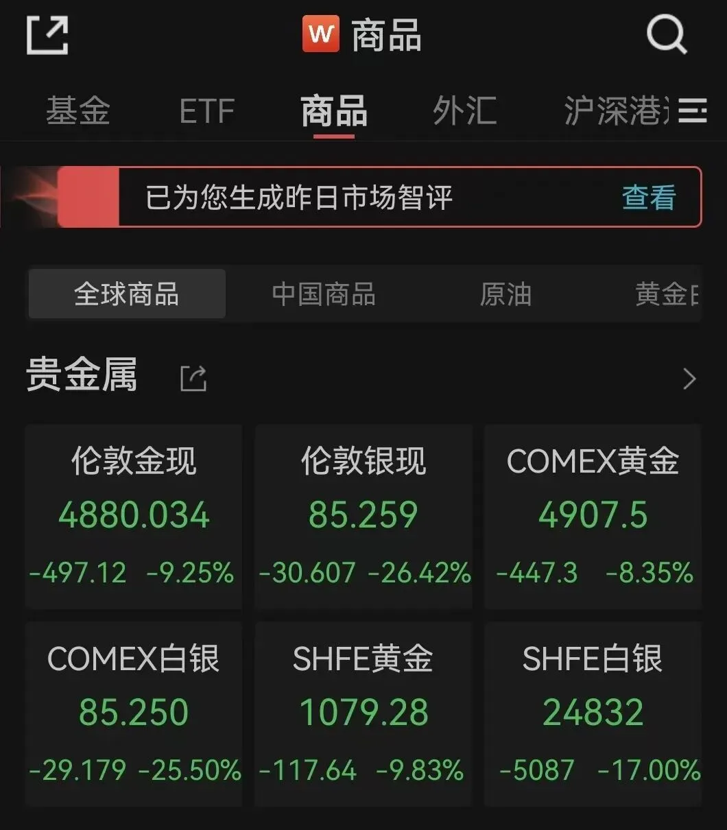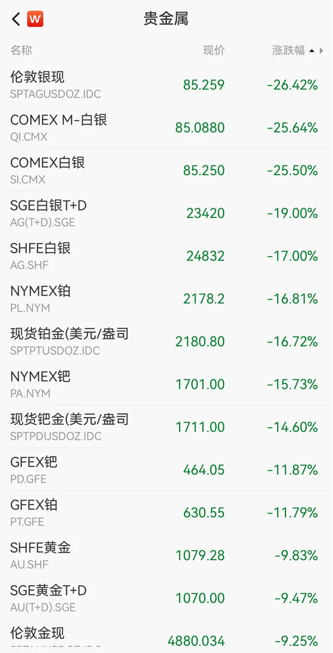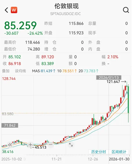 先看贵金属收盘数据:现货白银盘中最高暴跌至36%,最后报收85.259美元/盎司,日跌26.42%,跌回到1月13日左右价格。