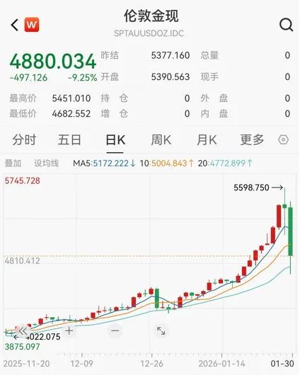 现货黄金盘中最高跌超12%,最低跌破4700美元/盎司,最终报收4880.034美元/盎司,日跌9.25%,跌回1月22日左右价格。