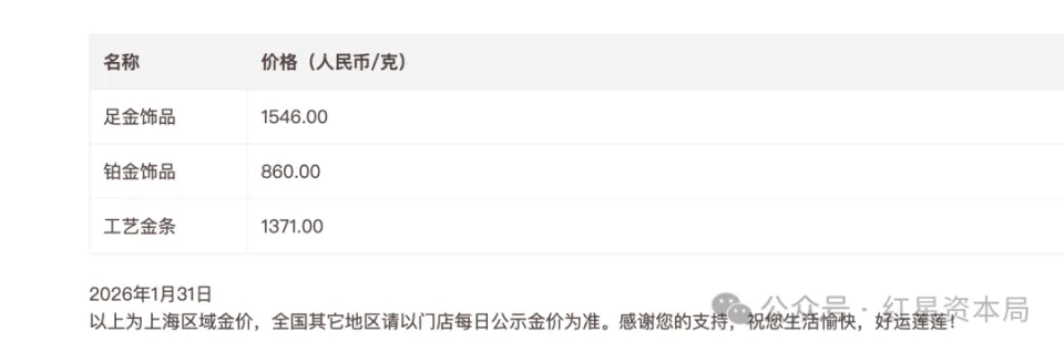 红星资本局查询发现,到今日上午,周大福已调价为1625元/克、周生生报价1618元/克,老庙黄金更是下跌至1546元/克,一夜之间每克暴跌122元。