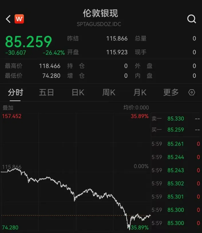 现货白银一度暴跌超过36%,创出历史最大日内跌幅,最低下探至74.28美元/盎司。截至收盘,现货白银下跌26.42%报85.259美元/盎司。