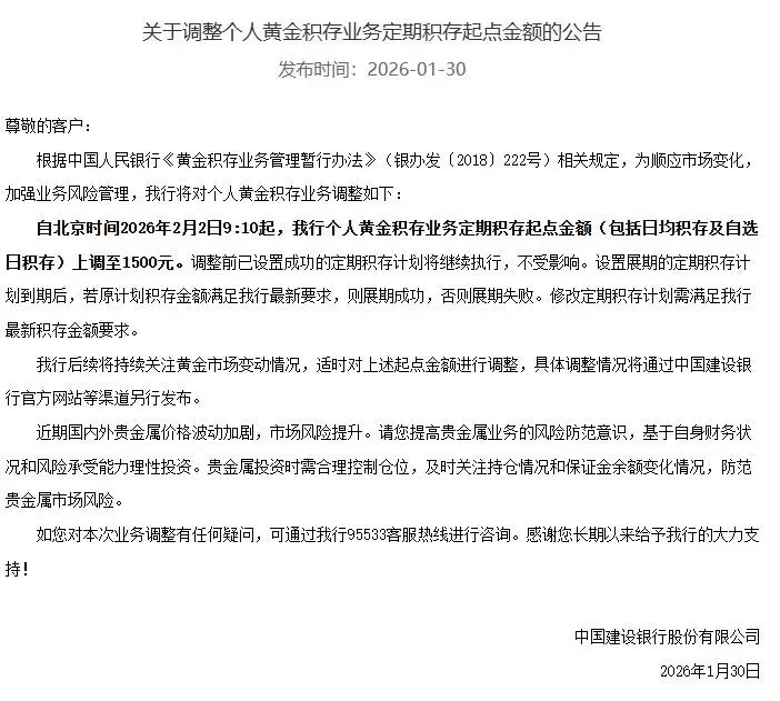 建设银行宣布,自北京时间2026年2月2日9时10分起,个人黄金积存业务定期积存起点金额(包括日均积存及自选日积存)上调至1500元。调整前已设置成功的定期积存计划将继续执行,不受影响。