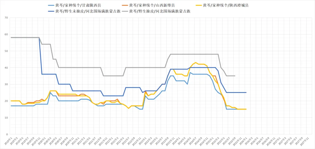 近期行情平稳运行, 走货一般,价格低,热度不减,目前种植季结束有两个月了,据统计减产百分之45元左右,距离产新还有4个月,目前3-10饮片颗粒价格为40元每公斤,10到18价格43元每公斤,后市持续关注。