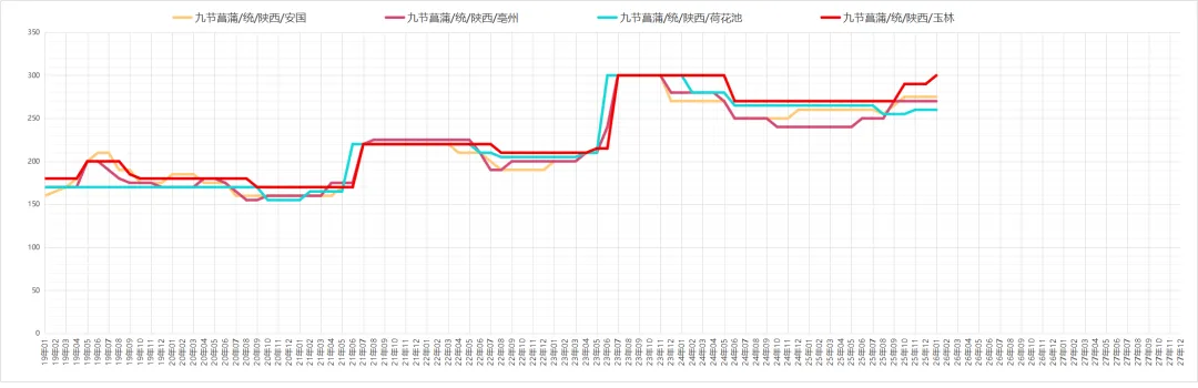 九节菖蒲行情坚挺,产区货源随着外销,货源供应量减少,近期持货者喊价坚挺,现市场九节菖蒲水洗货因质量不等多报价在290-320元之间,持货者继续看好后市。