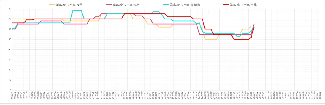黄精价格上涨,近阶段货源持续走畅,行情坚挺上行,药厂货价格在45-50元之间;优质饮片货少,价格在60-70元之间。