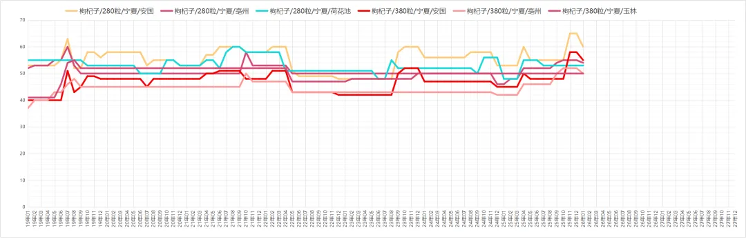 枸杞子行情逐步上调,在产地走畅、价扬的带动下,市场行情逐步上调,宁夏280粒售价60元左右;350粒52-53元,货源走动畅快。