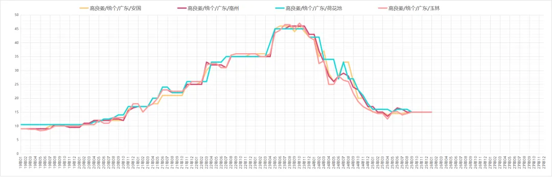 高良姜货多行情继续平淡,近期商家采购量不大,产地和市场货多,行情继续平淡,现无硫个子价格在14.5-15元之间,产新临近,后市利好有限。