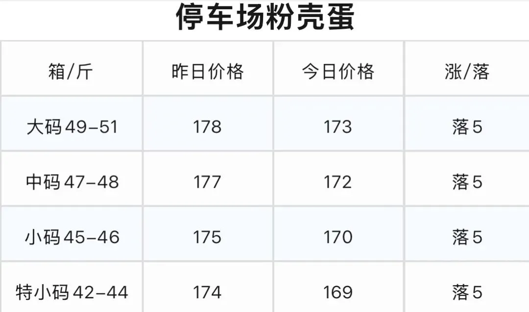 1.粉壳蛋:各规格价格均下跌5元/箱