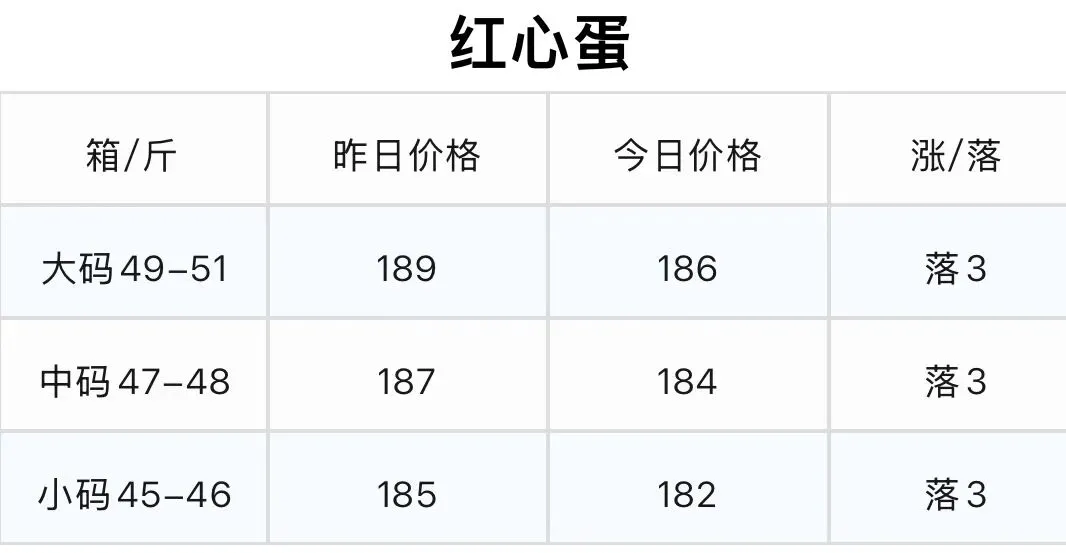 3. 红心蛋:各规格价格均下跌3元/箱。
