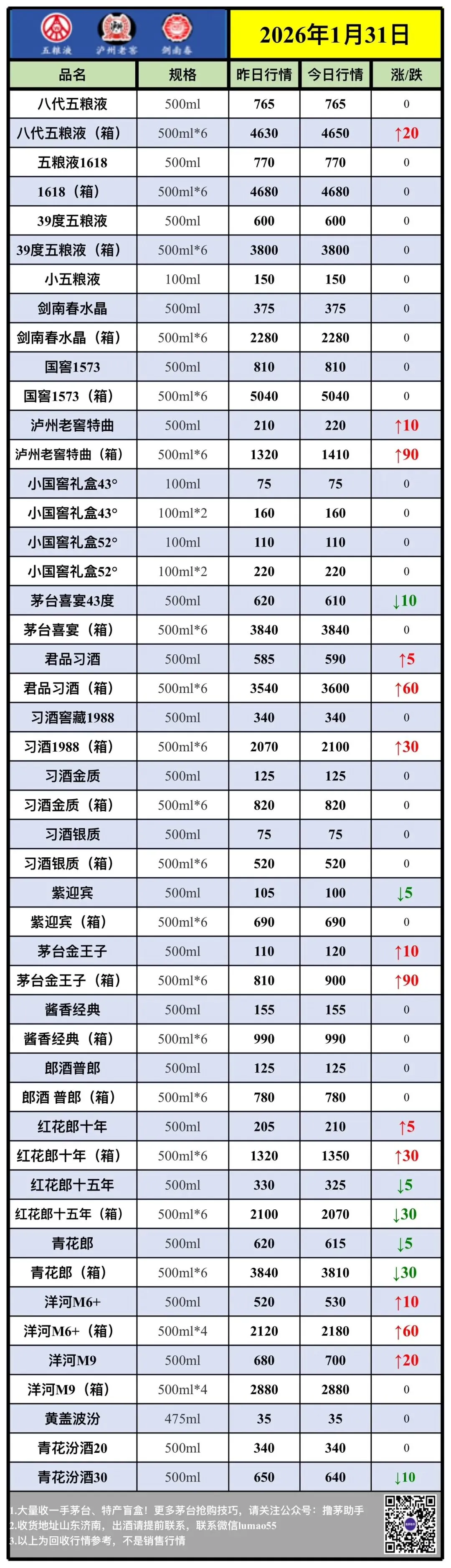 1月31日茅台五粮液每日最新行情-收货结算价