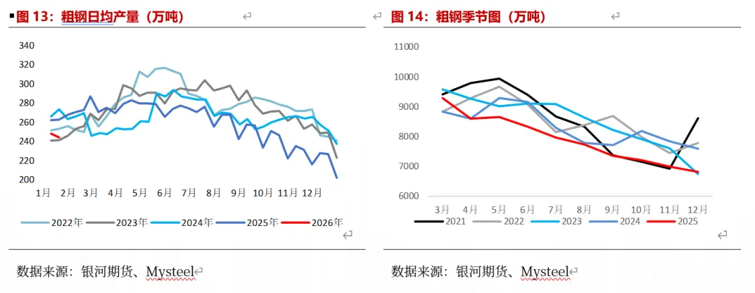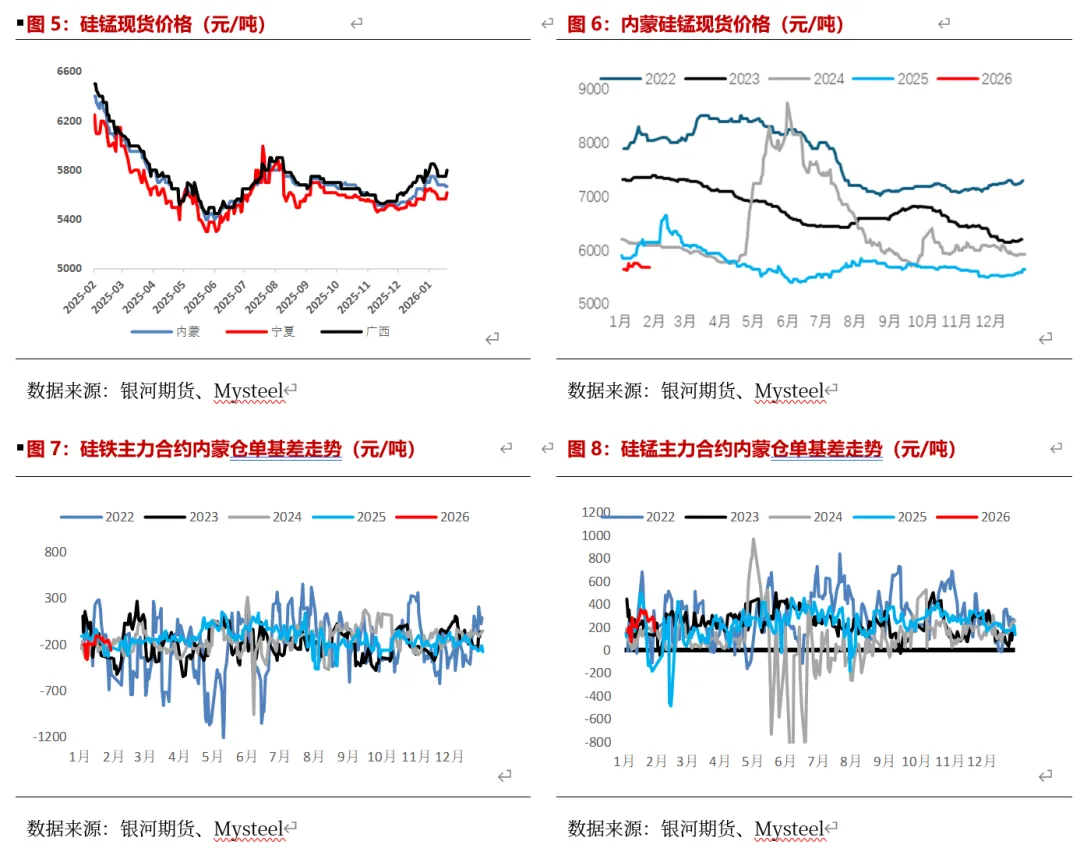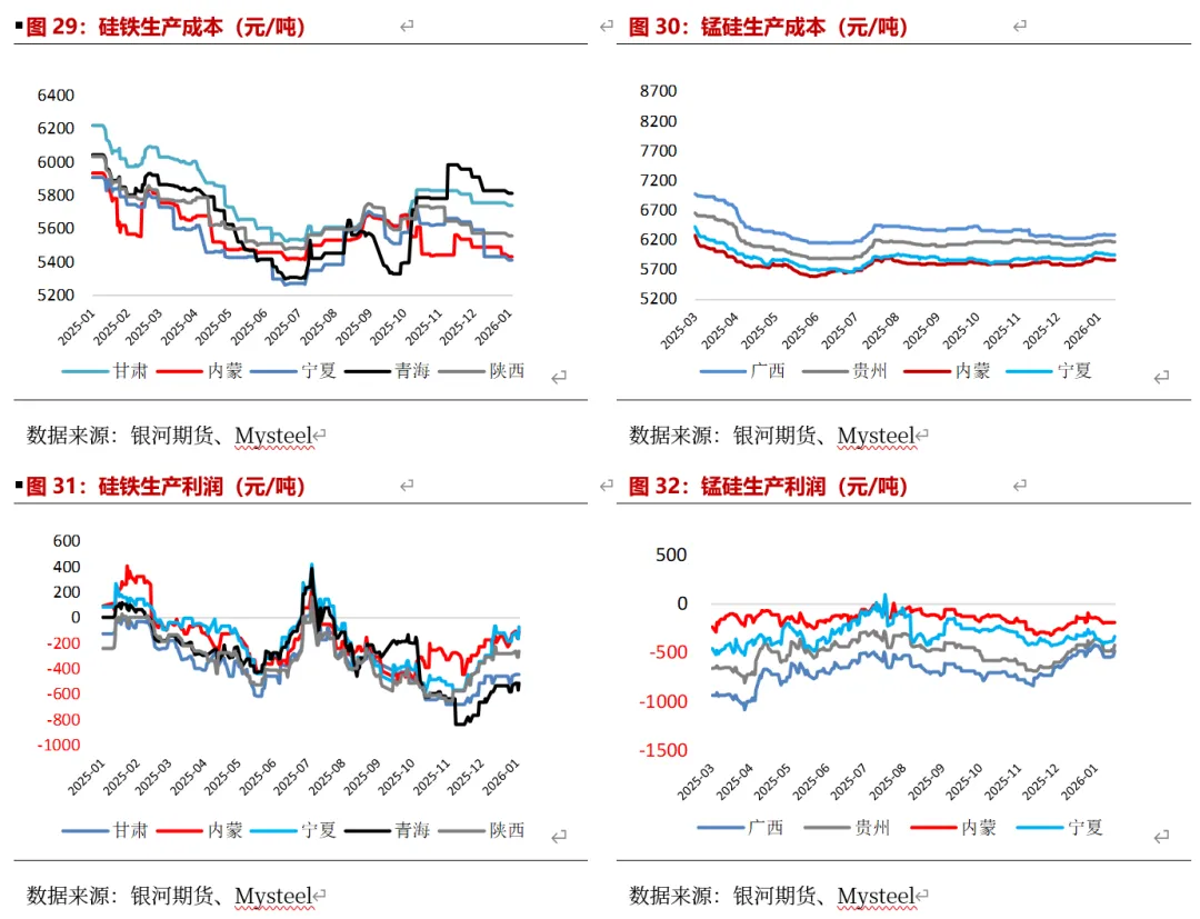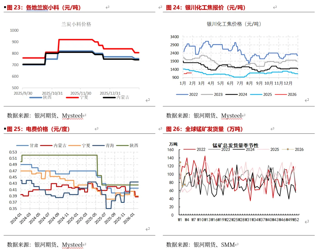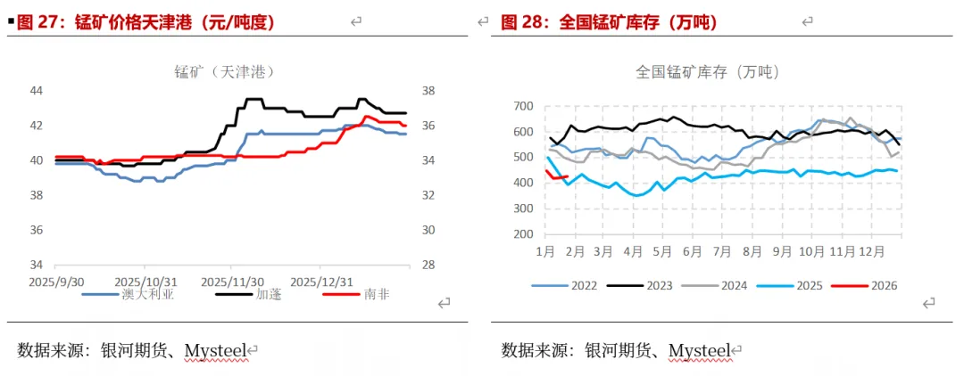 需求方面,铁水产量在1月呈现窄幅波动走势。钢联数据显示,1月29日当周,247家样本钢厂日均生铁产量为227.98万吨,环比下降0.12万吨。展望2月,近期钢材利润有所反弹,短期产量平稳为主,但库存开始季节性累积,预计春节前将以季节性减产为主。从钢厂高炉检修计划推算,预计春节前后铁水产量先抑后扬。总体来看,现实端目前处于供需双弱的状态,展望2月及春节后,仍然存在供需改善的预期。供应端受陕西差别电价文件影响,当地企业存在技术改造需求,或使得开工率维持低位。需求端,铁水产量在春节后预计仍有季节性复产,带动原料需求上行。1月合金厂库存表现分化。1月29日当周,Mysteel统计全国60家独立硅铁企业样本库存量6.79万吨,环比增加0.07万吨;全国63家独立硅锰企业样本库存量37.3万吨,环比增加0.03万吨。总体来看硅铁库存相对正常,锰硅库存偏高,但此前持续累库的情形有所缓解。下游库存方面,如前文所述,钢材利润近期小幅修复,同时2月初临近春节假期,钢厂仍有阶段性补库需求。不过由于钢材利润绝对值仍然偏低,预计补库力度较为有限,钢厂整体延续低原料库存思路。1月主产区电价稳中偏弱为主,不过随着陕西差别电价文件发布后,内蒙地区电价也有上调预期,总体来看电价对合金成本仍然构成明显支撑。