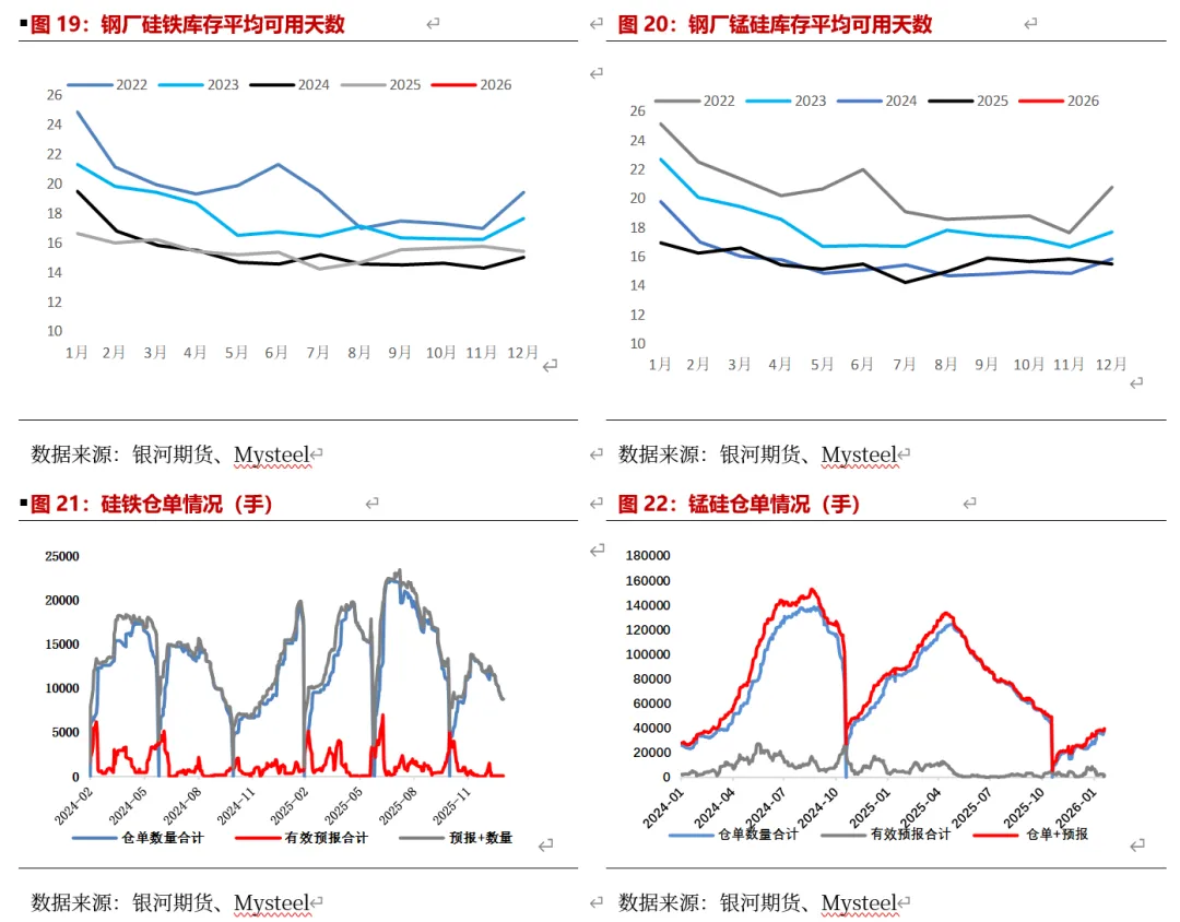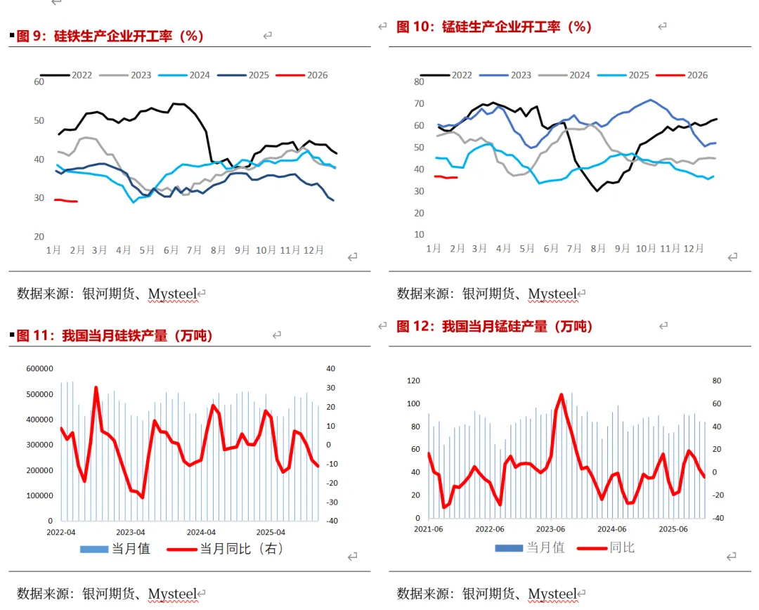 硅铁方面,供应端持续处于低位,同时陕西差别电价文件发布后,当地企业存在技术改造需求,供应端仍有收缩预期。需求端,近期钢材利润有所修复,但钢材库存开始季节性累积,预计2月铁水产量在春节前后先抑后扬。总体来看,基本面目前供需双弱,未来有边际改善预期。成本方面,主产区电价平稳运行,部分产区电价仍有上调预期。硅铁目前估值水平偏低,2月价格震荡偏强为主。锰硅方面,样本内企业产量低位继续下降,但1月有部分新增产能投产,整体供应端平稳为主。需求端,近期钢材利润有所修复,但钢材库存开始季节性累积,预计2月铁水产量在春节前后先抑后扬。成本端,锰矿港口库存低于往年同期均值约100万吨,现货价格坚挺,海外矿山2月报价均有小幅上涨。锰硅估值水平偏低,2月或震荡偏强。策略推荐: