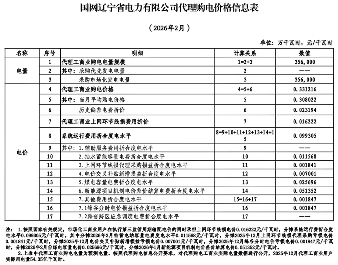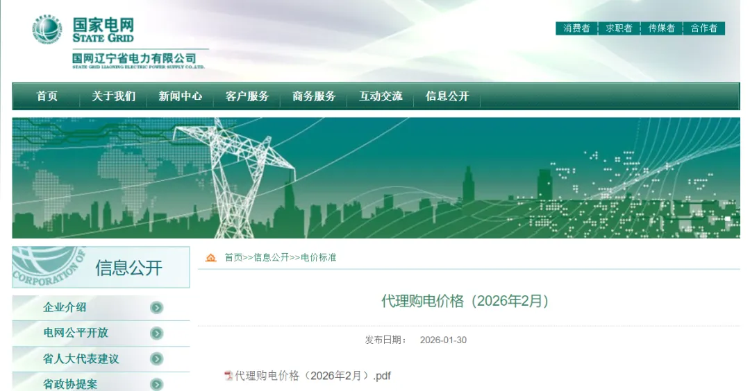 >国网辽宁省电力公司 | 发布代理购电价格信息(2026年2月)