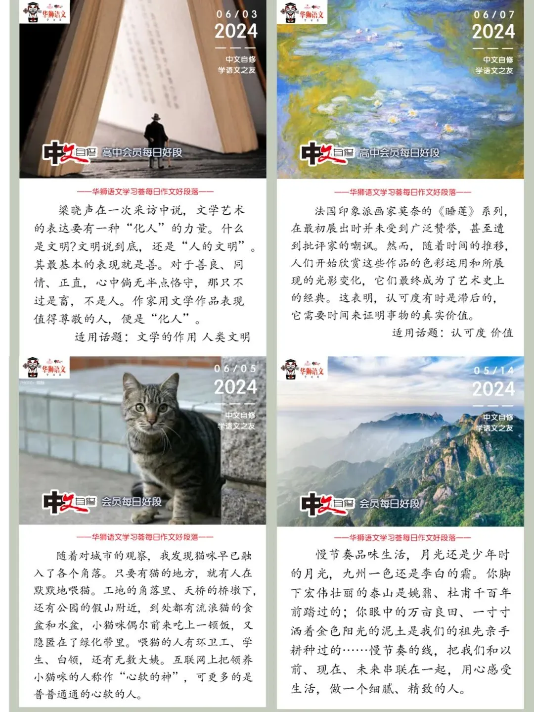 日积月累,方能厚积薄发。每个工作日都能在会员群内收到这样一段最精华的优质段落,满足你的摘抄、仿写所需,助力写作加分。