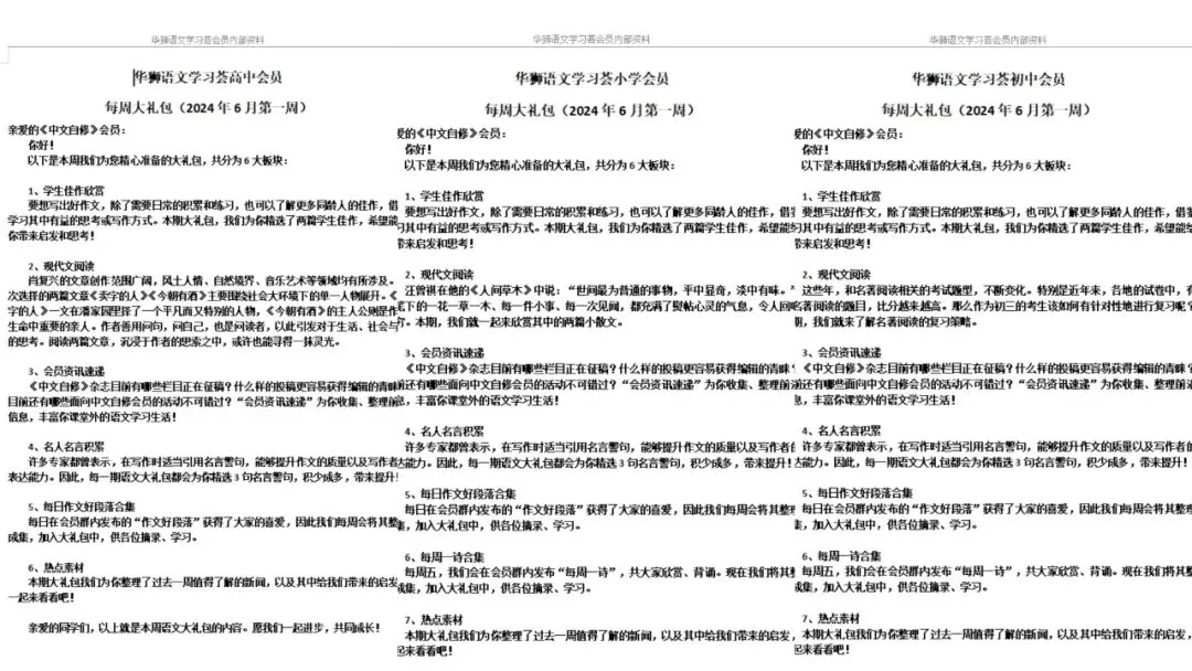 每周五下午,可以在会员群中收到一份大礼包,word文档形式,方便观看。内容涵盖语文学习的六大板块,从古诗文、现代文阅读到写作素材积累,渗透语文学习的各个环节。