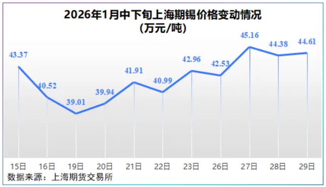 2026年开年,锡价持续上扬,127SHFE沪锡已经突破45万元/吨,开年涨幅已超21%
