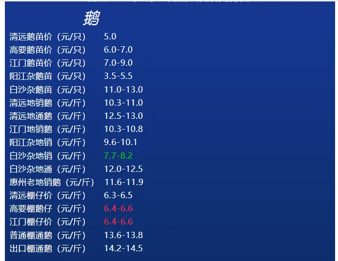 江门鹅苗7-9(元/只)棚仔48-50天6.3-6.6(元/斤)地销70-80天10.5-11.5(元/斤)地通90-100天13-13.5(元/斤)棚通90-100天12-12.4(元/斤)