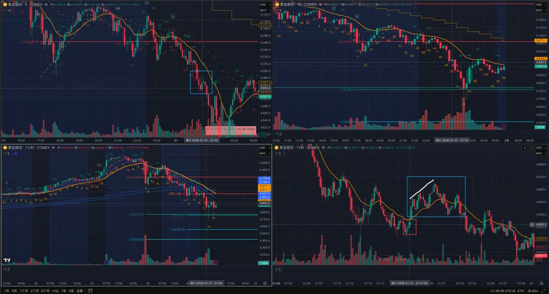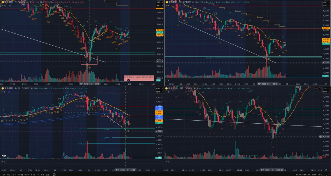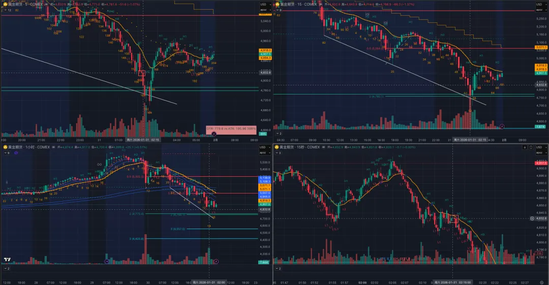 自从昨天开始下沉15s级别发现太多机会,叠加黄金这两天波动率放大五倍(甚至十倍),大部分入场能很快拿到结果。同时也看明白之前只看5min发现不了的问题,比如信号K的错判、不该接的飞刀、或是仅相邻两根K线间内部明确的波段机会。