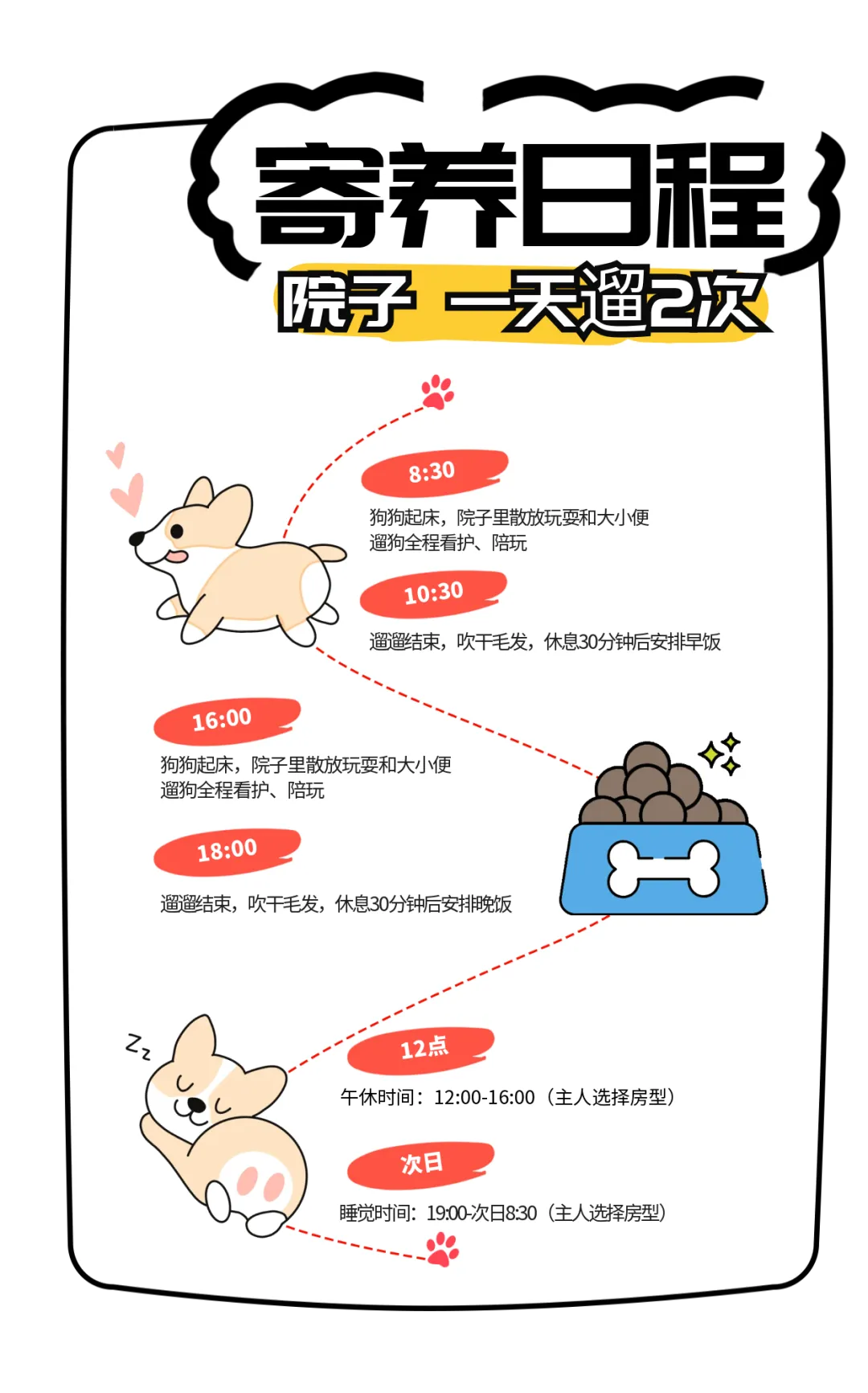①遛遛安排(自己玩or跟狗玩);②吃饭安排(遛后休息30分钟后吃);③睡觉安排(关笼or散放)。