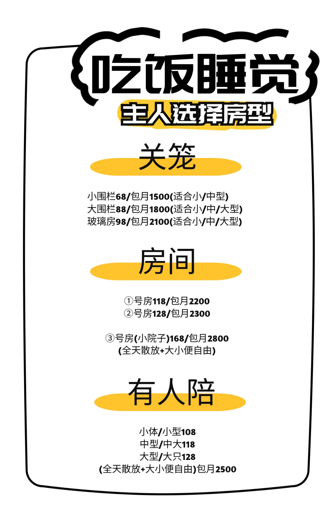 ①有笼子(适合在家习惯住笼的狗狗);②有房间(适合在家习惯散放的狗狗);③有人陪(适合粘人或分离焦虑的狗狗)。建议主人根据狗狗在家习惯和性格选择合适房型。一直吠叫(可尝试换房,还是不适应,主人接回家)。