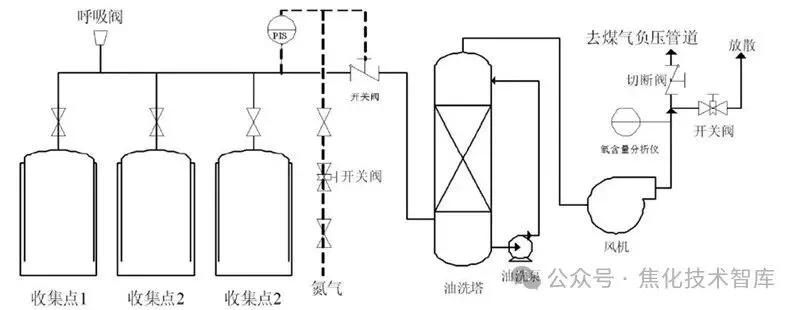 ①粗苯储罐进料时排放的废气,经过接管呼吸阀呼出方向的管路,当管路上压力变送器感应到100 Pa,自动开启密闭气相管路排气方向的阀门,储罐排放机油气输送到回收设备,冷凝回收处理。
