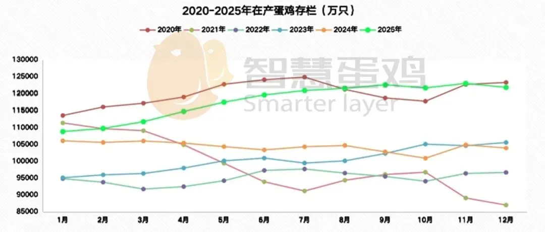 供给端持续宽松是2025年蛋价指数偏低的核心决定因素,具体体现在在产蛋鸡存栏量的高位运行与稳步攀升。从年度数据来看,2025年度月均在产蛋鸡存栏量达11.78亿只,位居近六年历史第二高位,仅低于2020年的12.09亿只;较2024年增加1.1亿只,增幅10.3%;较近6年均值增加0.94亿只,增幅8.67%。庞大的存栏基数直接保障了鲜蛋的充足供给,形成对价格的持续压制。