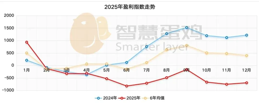 2025年度平均盈利指数-389点,同比2024年度的564点,下降了953点,降幅为169%;同比六年盈利均值564点,下降了655点,降幅为247%。盈利指数-389点,折合成每只鸡的年亏损为15.56元。