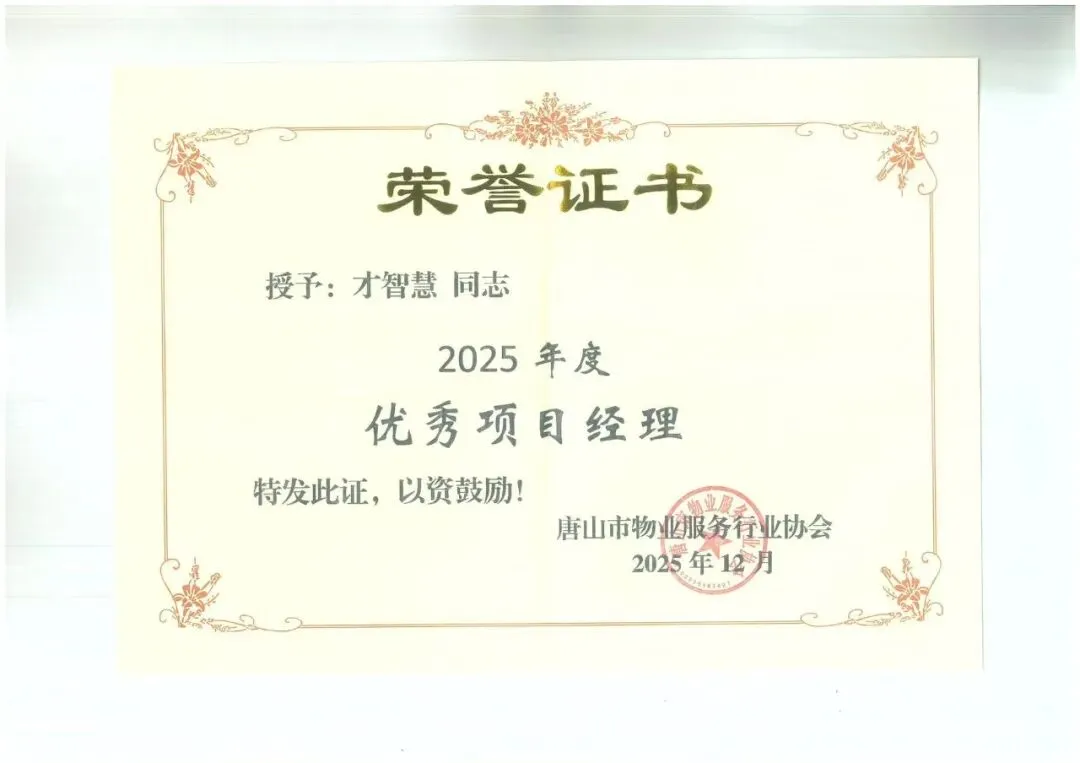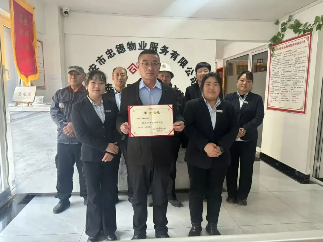 近日,迁安市泰和园小区被唐山市物业服务行业协会授予“物业管理标准化项目”,忠德物业泰和园服务中心经理才智慧同时被授予“2025年度优秀项目经理”荣誉称号。