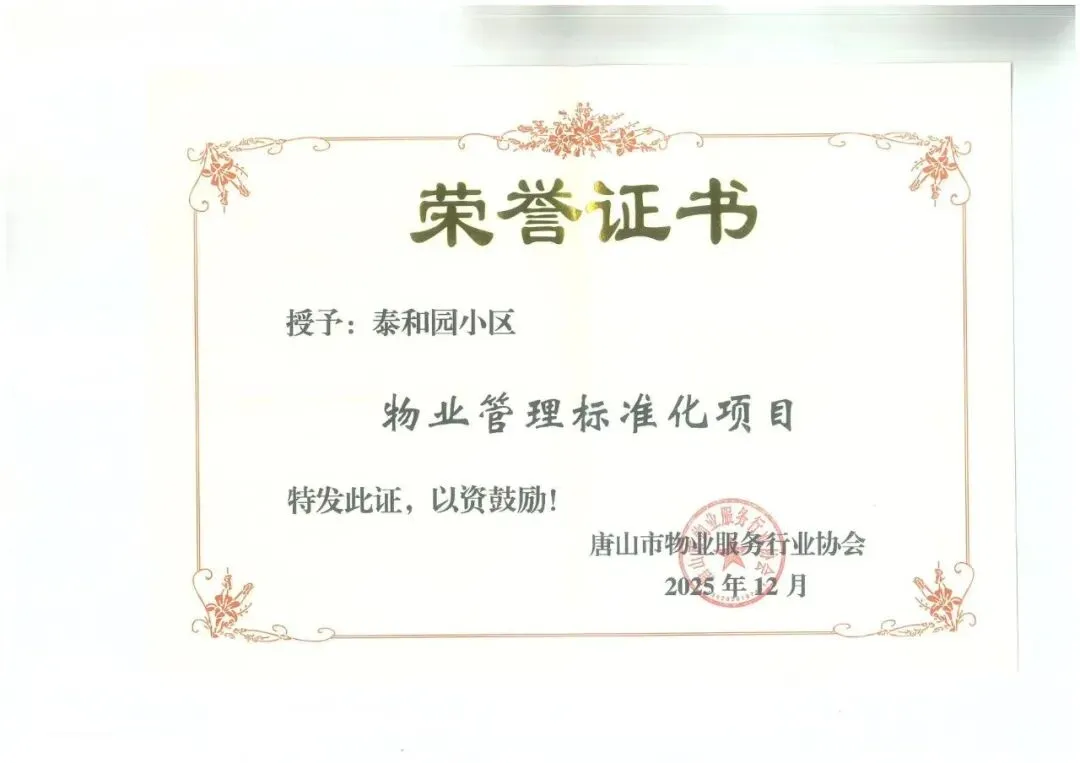 这份沉甸甸的荣誉,是唐山物业服务行业协会对泰和园服务中心工作的高度认可,更是对全体泰和园人同心协力、攻坚克难的最好回报。泰和园人始终深知,我们并非为了创优而创优,而是以创优为契机,将标准化管理融入物业服务的每一个环节,让规范成为习惯,让标准成为常态。