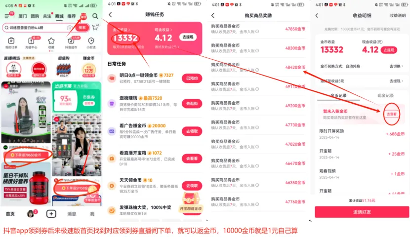 ①抖音里刷到券先不要下单,去打开抖音极速版,进入赚钱频道扫描上面的码可以直达(前提抖音极速版你需要积累一些金币膨胀的金额会大点)