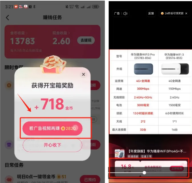 重点:这里有个bug就是一直刷广告那个无门槛券会一直增加(差不多就好不然会没掉)