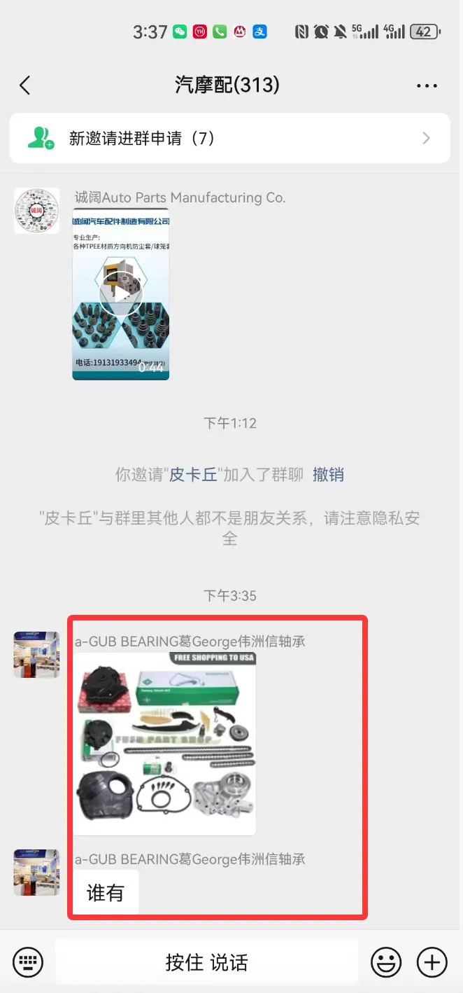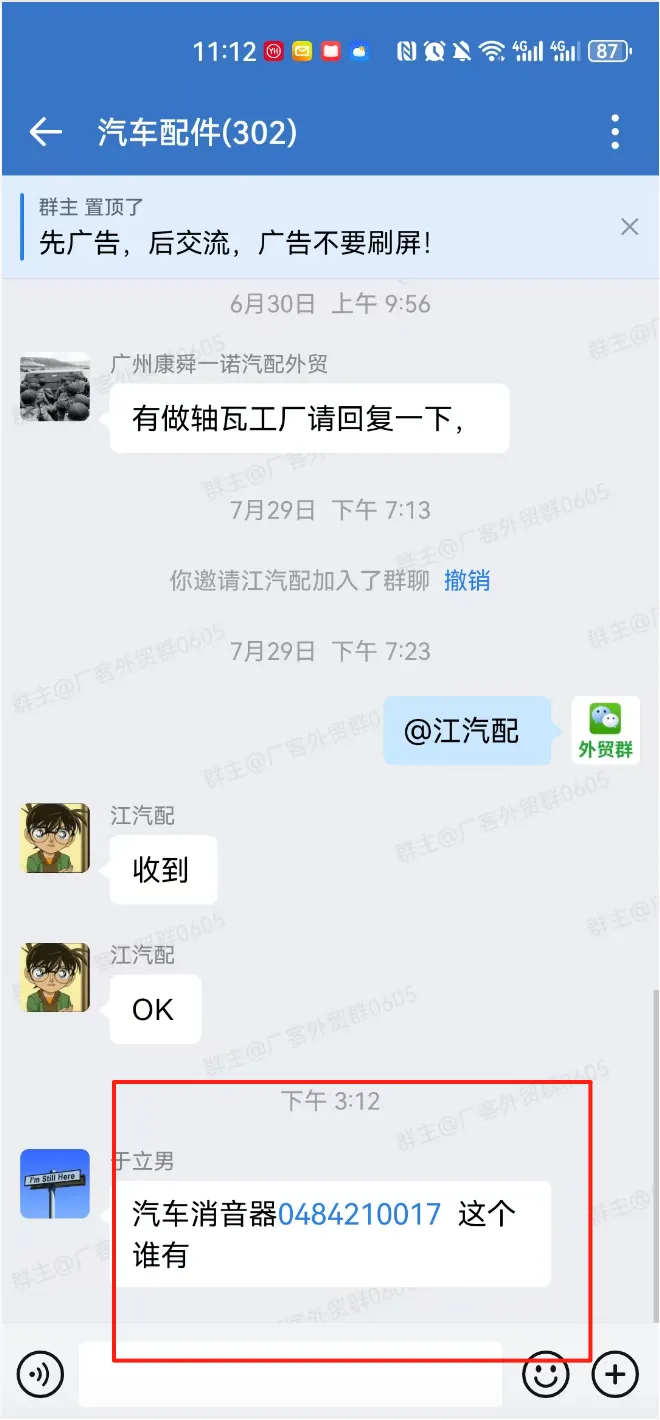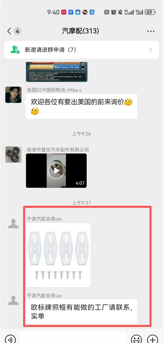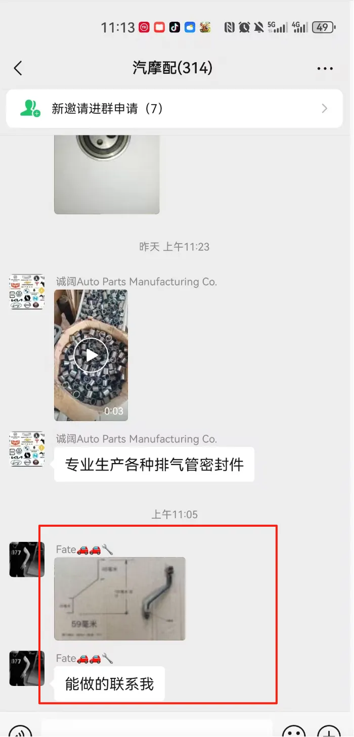 汽车配件群里可以发布的信息:外贸采购信息、产品销售信息,文字、图片、视频都可以,控制广告频率,不能刷屏广告。