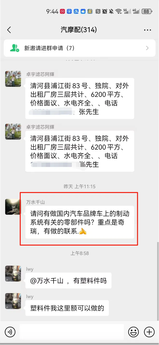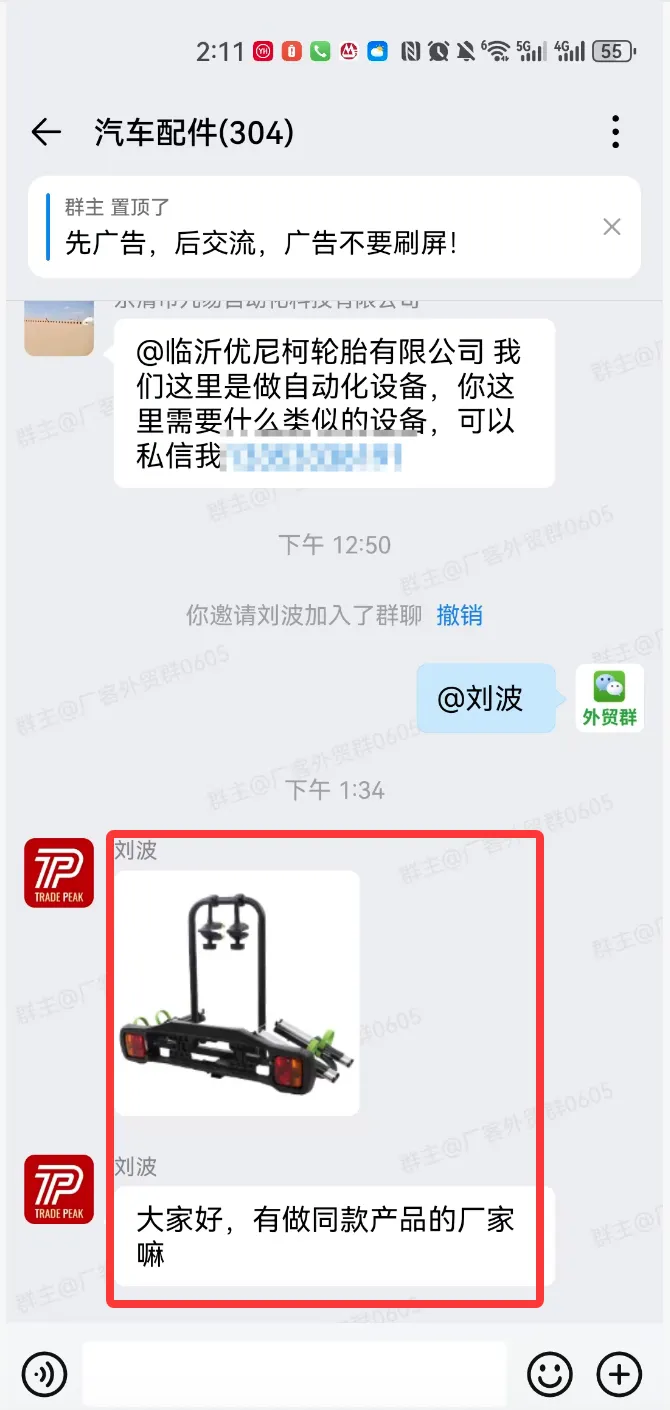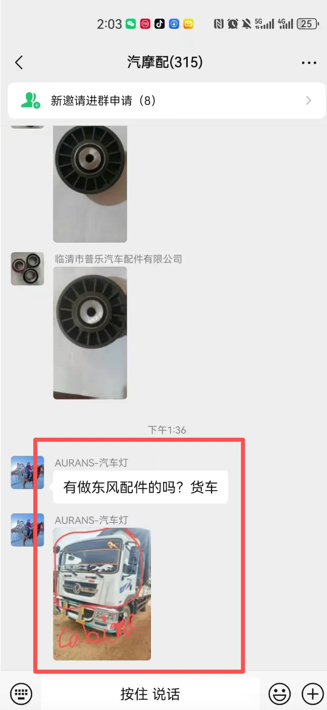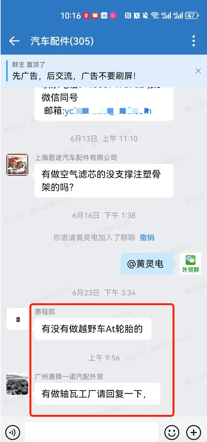 汽车配件群里可以发布的信息:外贸采购信息、产品销售信息,文字、图片、视频都可以,控制广告频率,不能刷屏广告。
