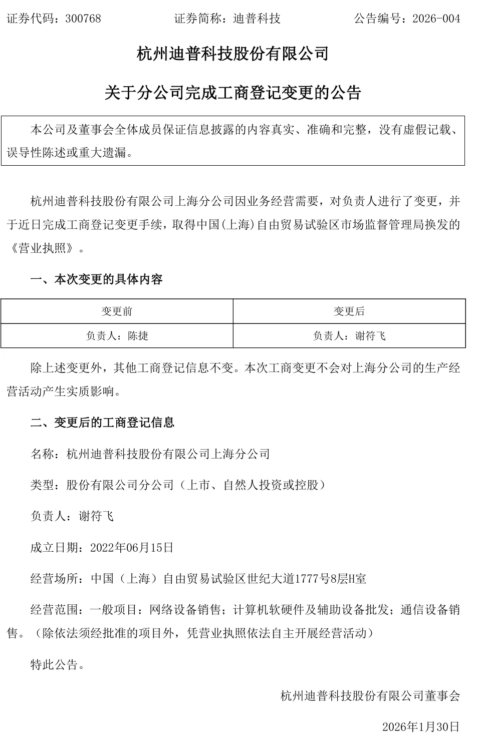 迪普科技1月30日傍晚发布《关于分公司完成工商登记变更的公告》。