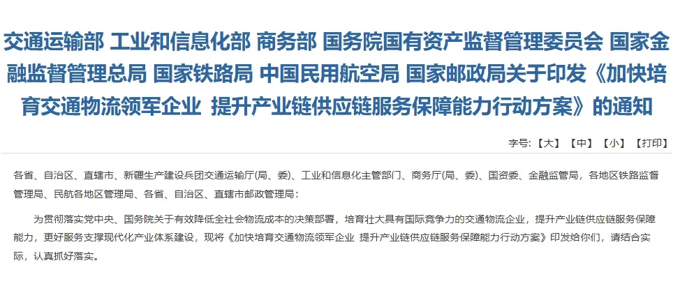 为贯彻落实党中央、国务院关于有效降低全社会物流成本的决策部署,培育壮大具有国际竞争力的交通物流企业,提升产业链供应链服务保障能力,更好服务支撑现代化产业体系建设,现将《加快培育交通物流领军企业 提升产业链供应链服务保障能力行动方案》印发给你们,请结合实际,认真抓好落实。