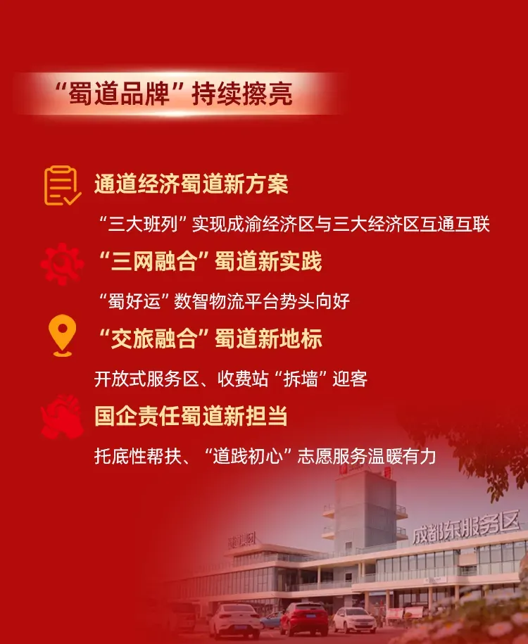 三要培育新质生产力,争做“创新引擎”。做强多式联运品牌,助力构建“三网”融合生态、持续降低全社会物流成本;充分发挥多产业链优势,打造一批零碳廊道、数智走廊;积极拓展旅游、低空经济等 “交通 +” 融合新业态,为行业转型升级提供更多可复制推广的“蜀道样板”。