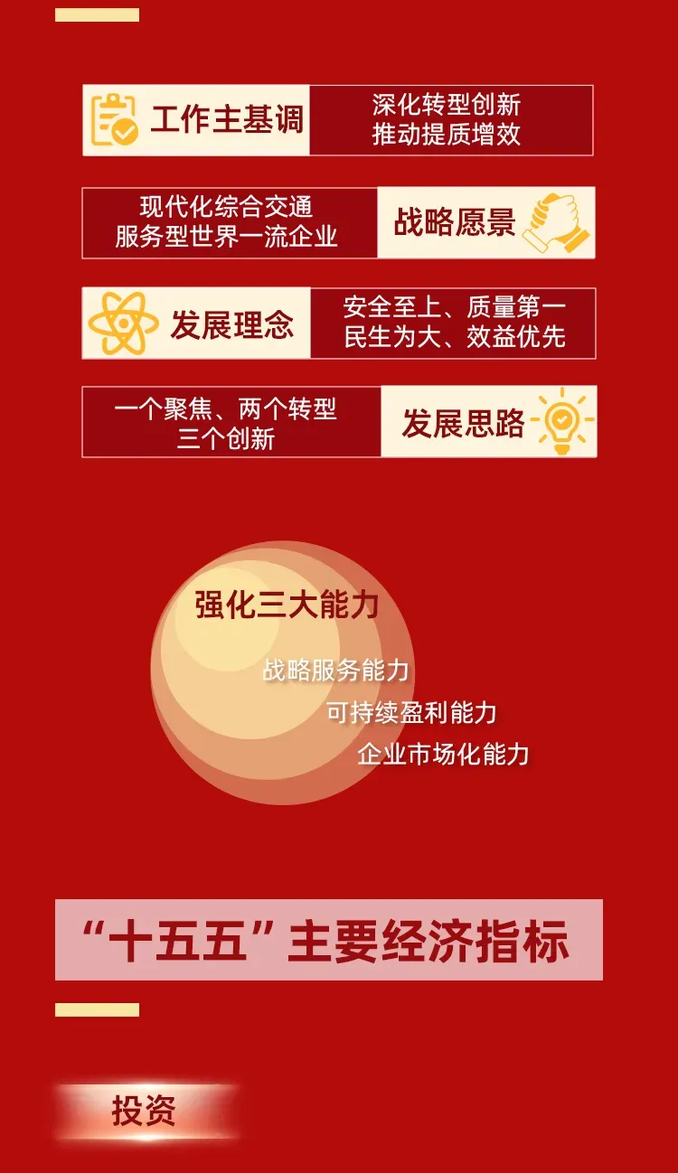 今年的主要目标是:投资总额力争保持2000亿元,营业收入同比增长5%以上,利润总额同比增长10%以上。严格落实安全环保主体责任制,牢牢守住不发生系统性重大风险的底板底线。