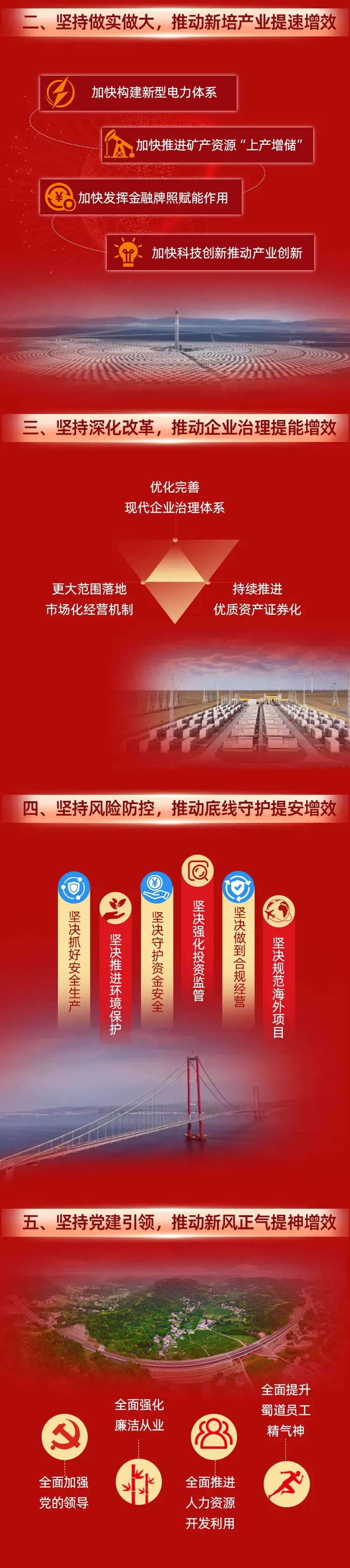 四要凝心聚力,筑强保障发展的主引擎。要加强政治建设,推动深度融合,统筹好发展与安全工作,以高质量党建、高水平安全引领保障企业行稳致远。要全面从严治党,持续正风肃纪反腐。要践行社会责任,继续做好托底性帮扶等工作,大力弘扬“两路”精神等优良传统和新时代“蜀道”文化。