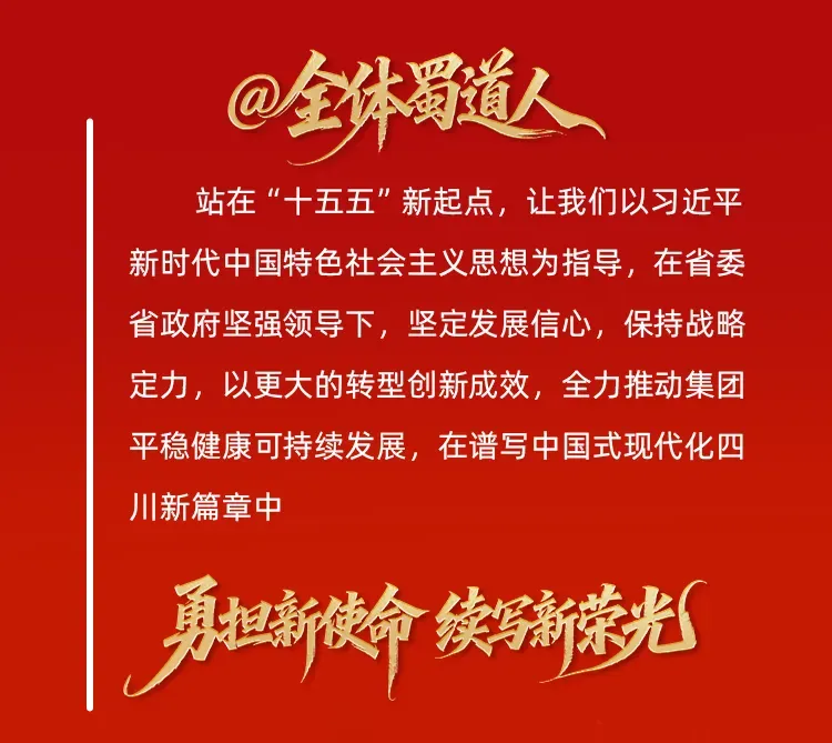 集团自2021年5月成立以来,紧紧围绕省委、省政府战略部署,始终坚持以党的建设为根本统领,以转型破解发展难题,以创新塑造竞争优势,以改革应对风险挑战,办成了一系列强基础、补短板、利长远的大事要事,发展战略已然成型、综合实力稳步提升、核心功能全面增强、发展方式加快转变、发展活力不断释放、互融互促成效彰显,走出了一条具有蜀道特色的新路子。刚刚过去的2025年,集团上下深刻领会“要树标杆、作表率”的殷切期待,始终保持战略定力,自我加压扩大有效投资,加快转型创新步伐,坚决守牢红线底线,党建引领更加有力,以“敢于担当、勇争一流”的企业精神,用实干业绩交出了改革发展的靓丽答卷。
