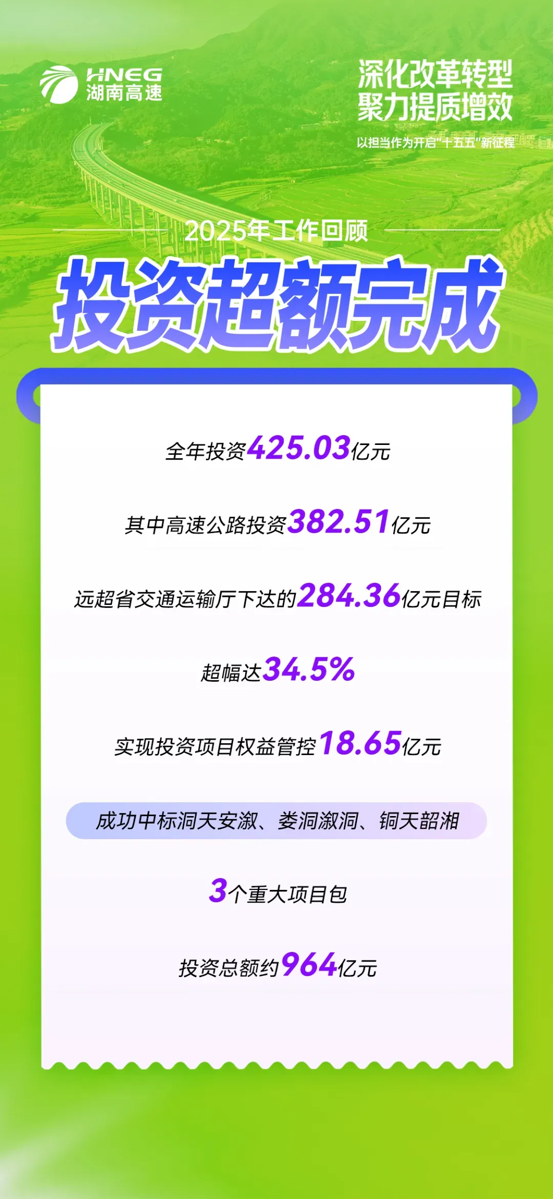 2025年,湖南高速集团以425亿元的全年投资额,其中高速公路投资382亿元,超额完成省定目标,展现出了强劲的执行力。