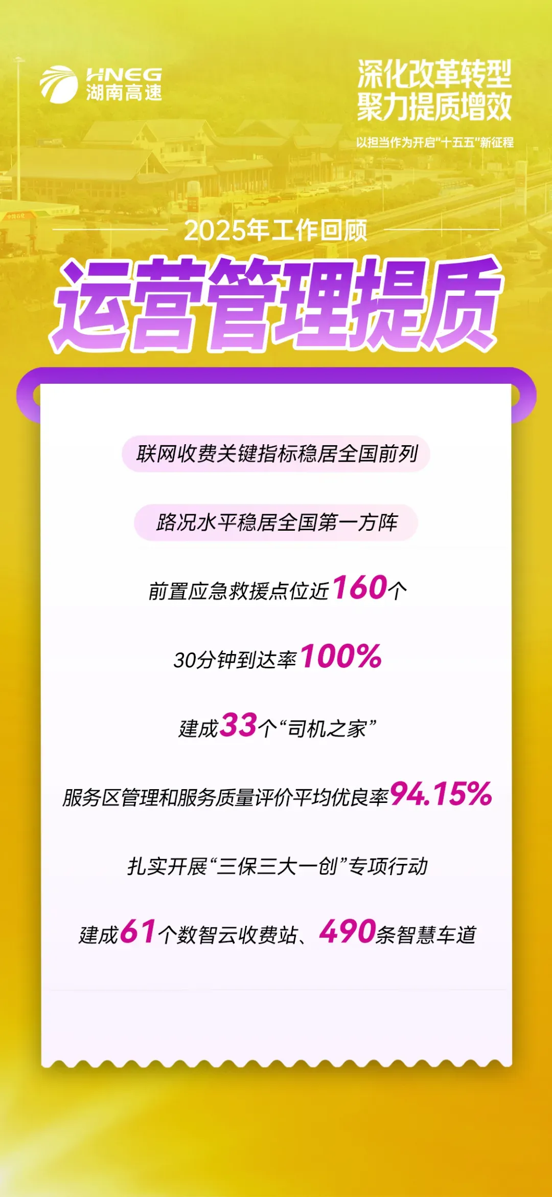 二要提升服务品质,树立“行业标杆”。锚定以人民为中心的发展思想,深入实施“五好高速”品牌建设,深化服务区提质升级,加快推进高速公路安全韧性提升工程,全力打造平安百年品质工程。