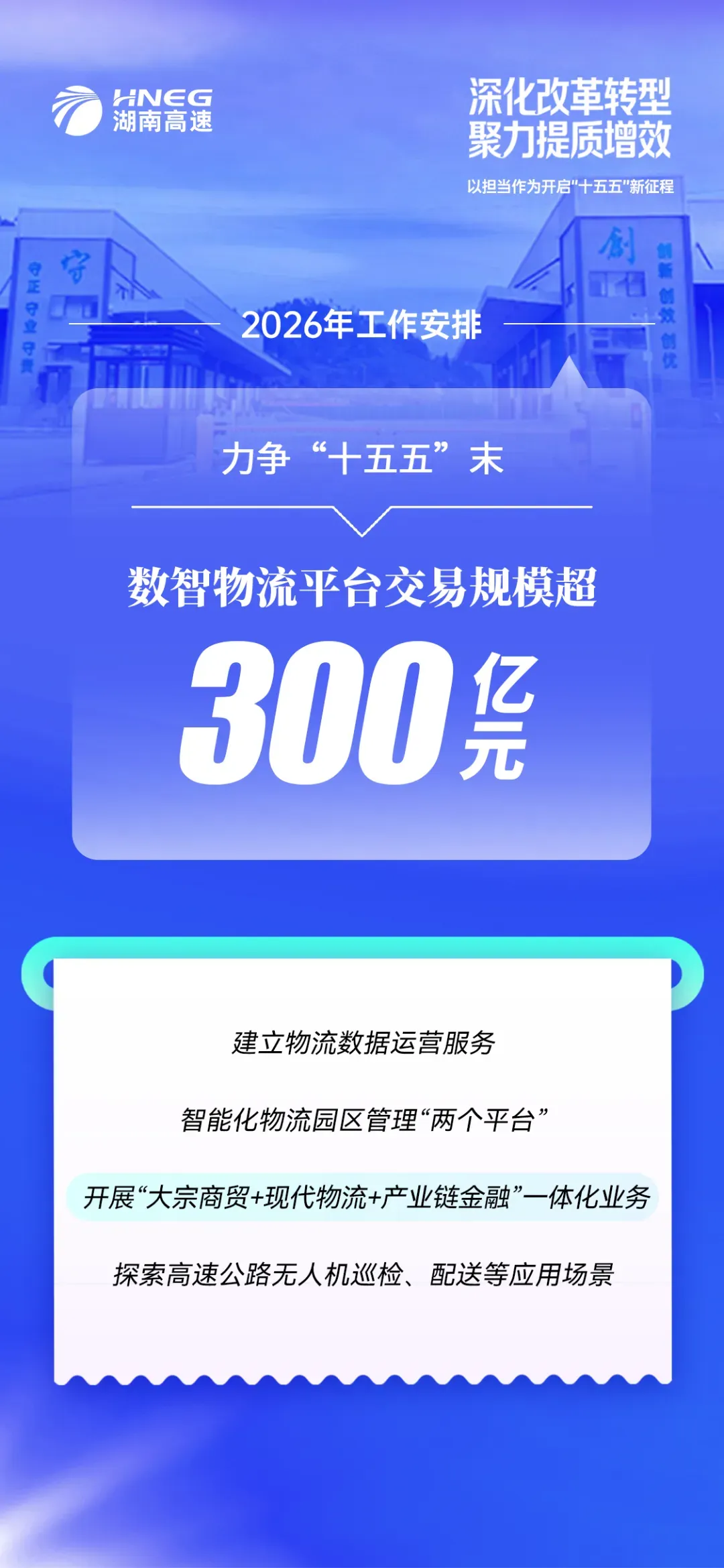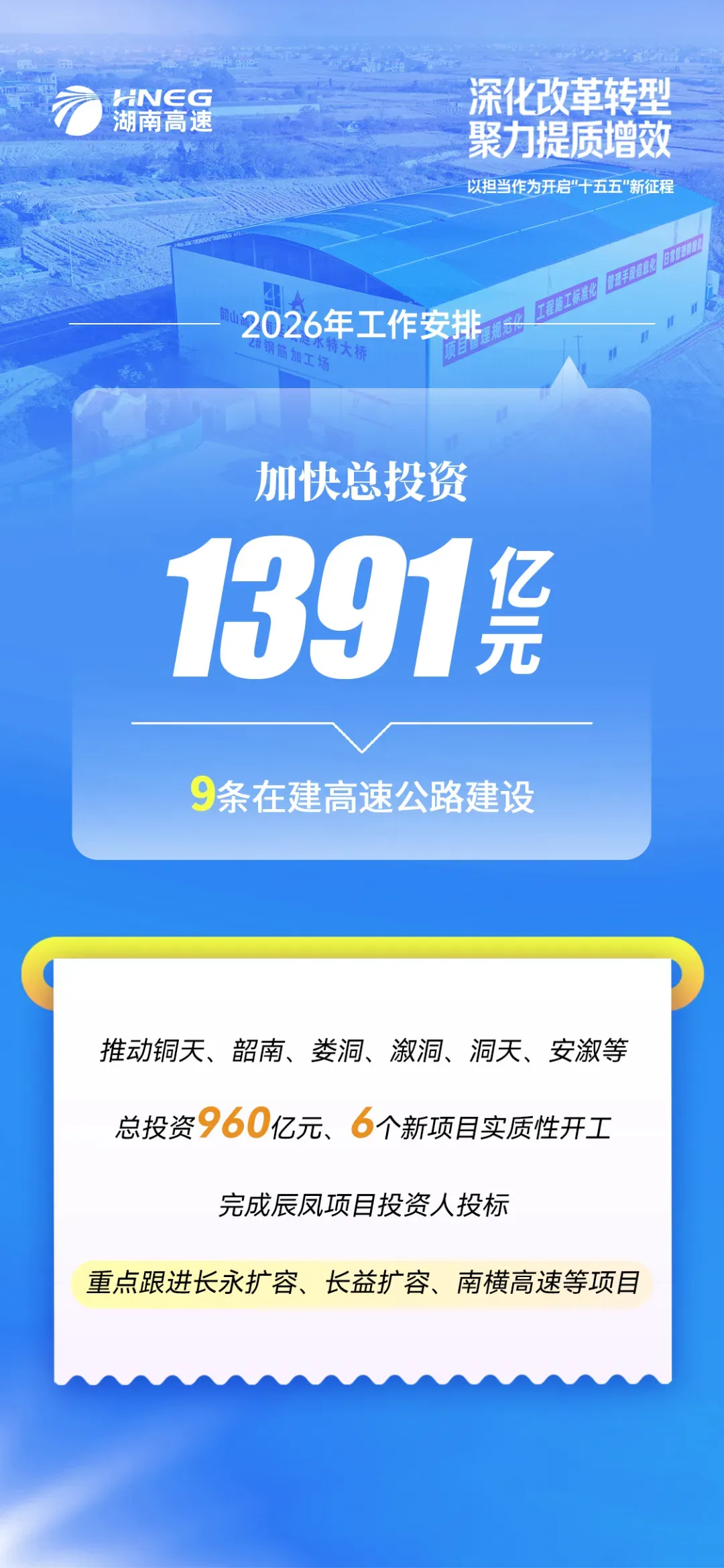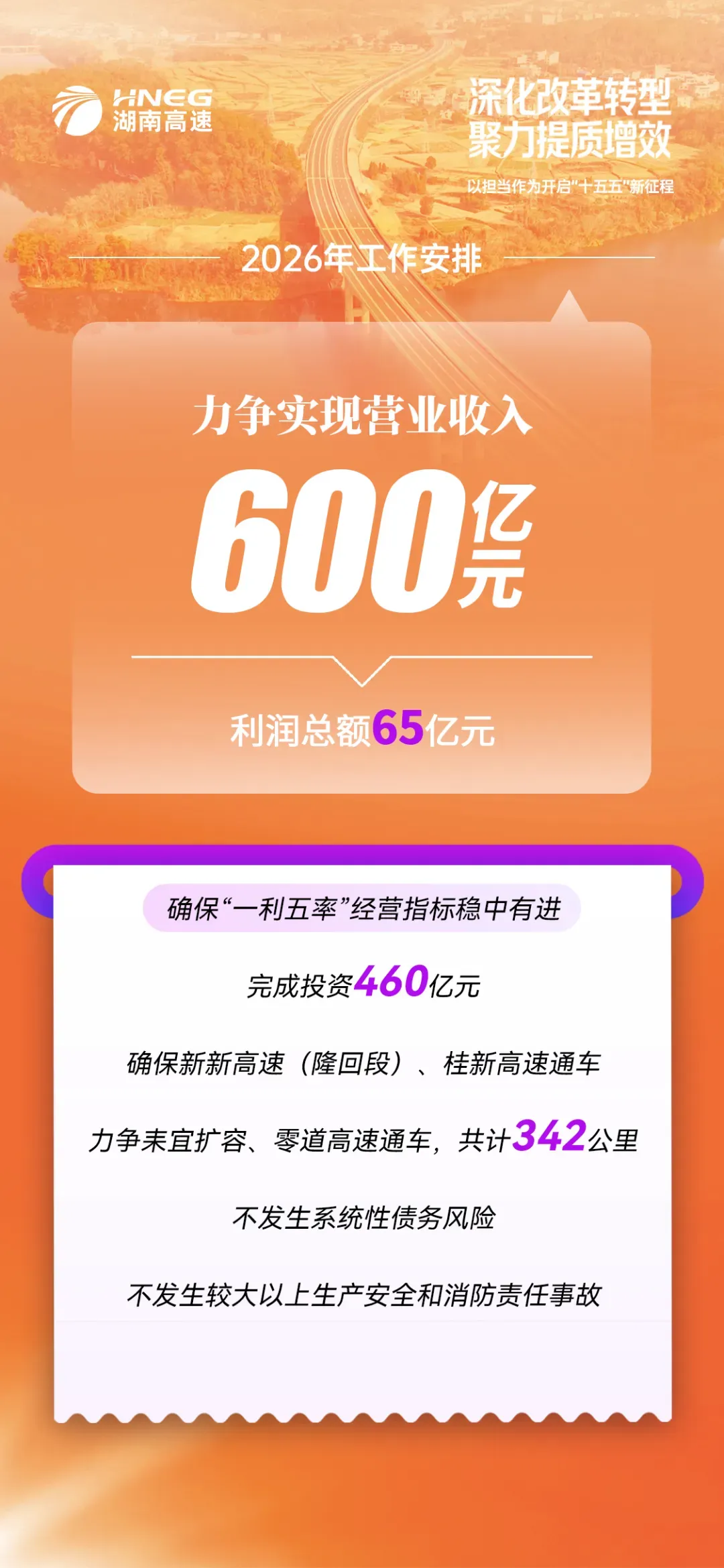 2026年,湖南高速集团锚定更高发展目标:力争实现营业收入600亿元,利润总额65亿元;完成投资460亿元,确保桂新高速通车,力争耒宜扩容、零道高速通车。