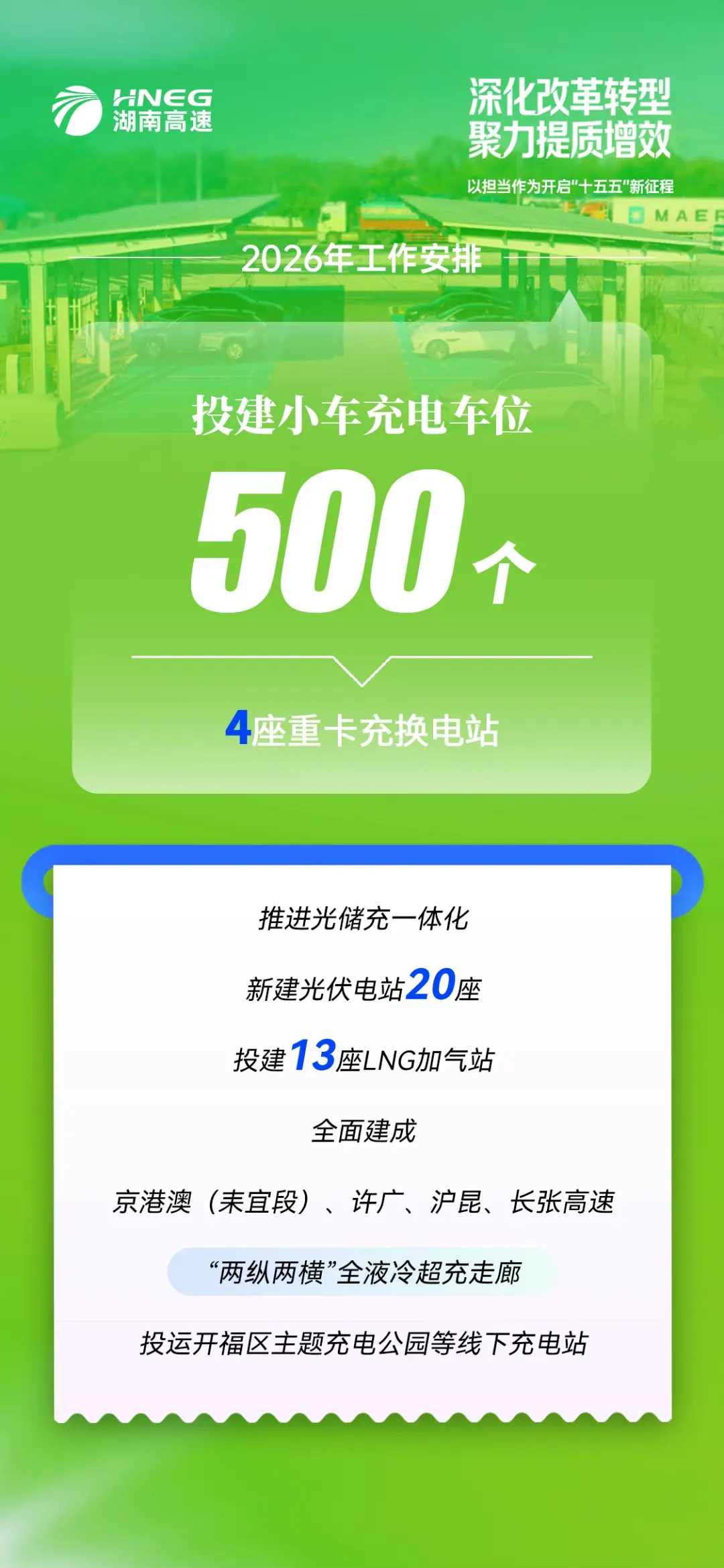 自主研发全国首个服务区场景充电运营平台,投建全省标准最高、综合业态最全的“光储充换服”一体化项目。在许广高速湖南段建成的全国首条全液冷超充走廊,为新能源汽车长途出行提供强有力的基础设施支持,交能融合工作被交通运输部列为典型案例。