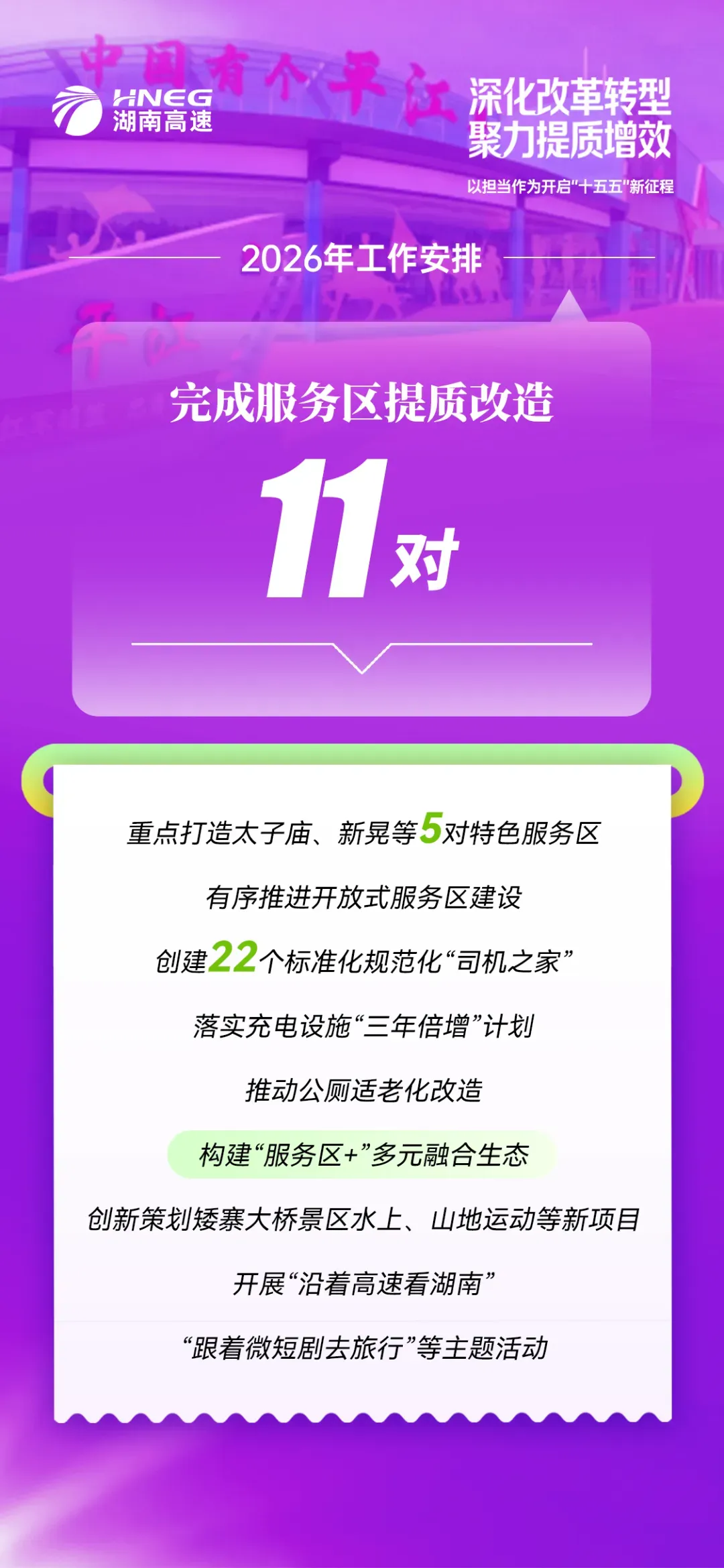 铜天、洞天、韶山南延线等一批项目顺利开工,靖黎、白新等通车项目顺利通过竣工验收。在吉首北服务区,该集团仅用4个月时间,就高标准建成全省首个开放式服务区,为全国服务区转型升级提供了可复制的“湖南方案”。