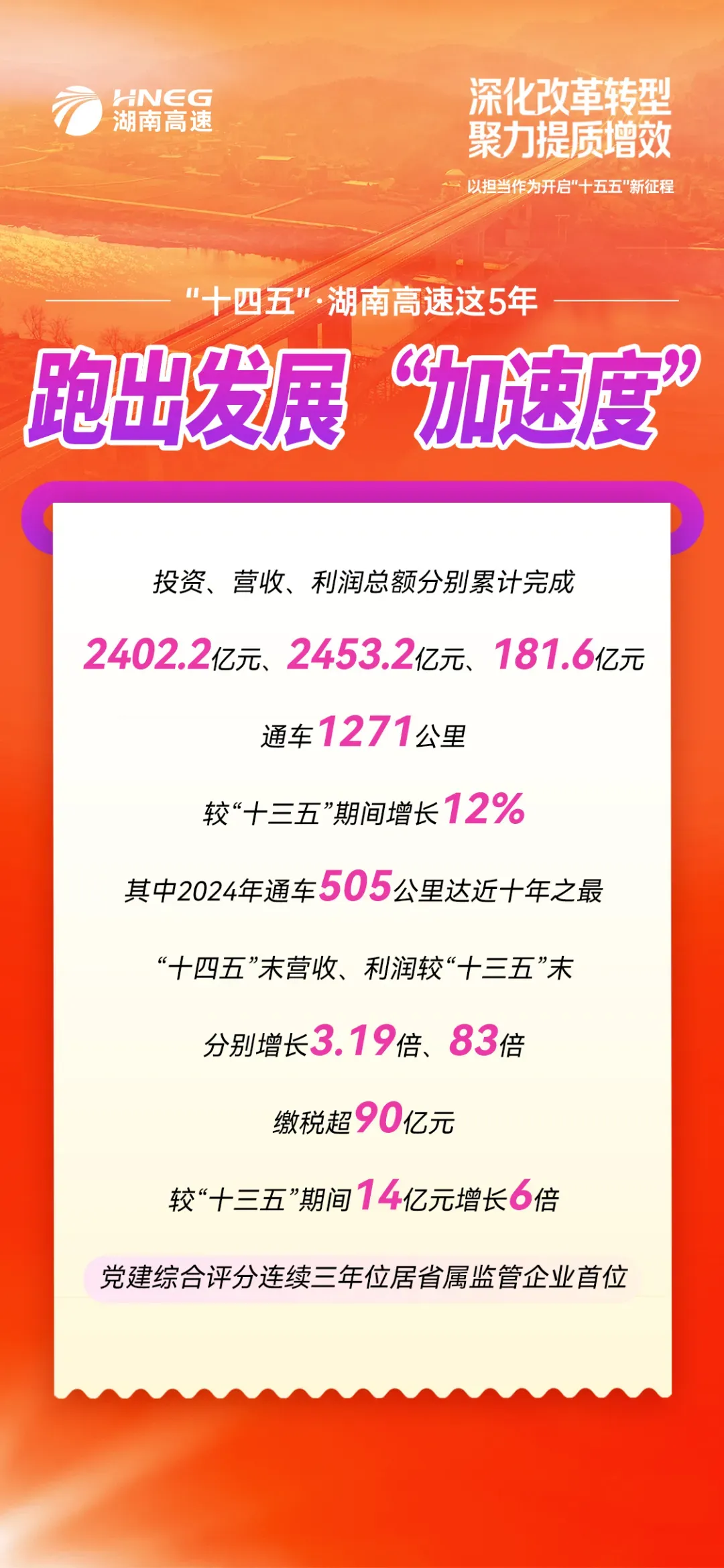 罗卫华指出,2025年是“十四五”收官之年。五年来,集团以战略为指引,跑出发展“加速度”。“十四五”期间,投资、营收、利润总额分别累计完成2402.2亿元、2453.2亿元、181.6亿元;通车1271公里,较“十三五”期间增长12%。“十四五”末营收、利润较“十三五”末分别增长3.19倍、83倍。缴税超90亿元,较“十三五”期间14亿元增长6倍。以改革为抓手,扩大湘高“知名度”。国企改革经验在省国资委国企改革推进会、国资大讲堂分享;三项制度改革经验纳入国务院国资委改革“案例库”。公路年度技术状况监测排名稳居全国前列。成功收购省外大广高速河南光山段、甬莞高速广东惠莞段、菏宝高速河南新长段、从莞深高速从莞段及联和服务区,湘高品牌响彻全国。以科技为支撑,点燃转型“强引擎”。战新产业实现营收22.3亿元。战略参股长城银河,实现“交通芯”自主可控。助力湖南成为全国第一批交通基础设施数字化转型升级示范区,绩效评价被交通运输部和财政部评为A档。省数智物流公司和设计咨询集团挂牌成立,产业规模化、集约化效应最大释放。以安全为底线,筑牢治理“压舱石”。连续五年获评平安建设先进单位,连续两年被评为全省安全生产和消防工作“优秀”单位,董事会工作连续四年获省国资委综合评价“优秀”等次。风控体系评级始终位居省属监管企业前列。成功晋级中债资信AAA评级,成为全省首家且唯一获评企业。