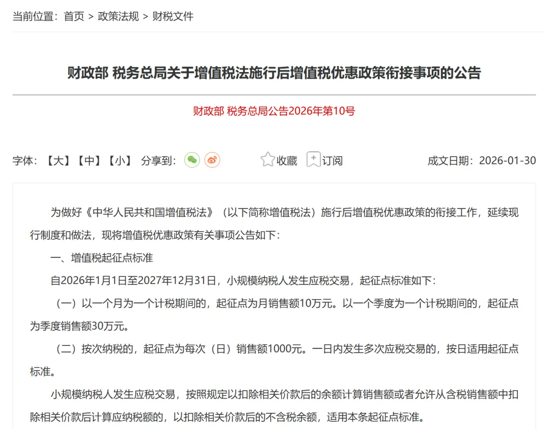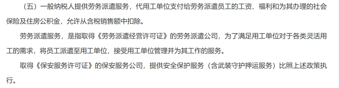 人力资源行业日夜盼望的政策文件终于来了!不过解读下来,喜忧参半,靴子只落地一半!1月30日,财政部、国税总局印发《关于增值税法施行后增值税优惠政策衔接事项的公告》(财政部 税务总局公告2026年第10号)。1月31日在国税总局官网已经可以查阅。1、今明两年(2026-2027年),一般纳税人提供劳务派遣服务(持许可证)、安保服务(持许可证),没有了差额5%,可按差额6%开票,因不属于简易计税,所以可以开专票,做进项抵扣 —— 这是落地的一只靴子,利好劳务派遣!2、除增值税法及其条例、本法、2025年17号公告外,其它的国内环节增值税优惠政策停止执行,意味着财税(2016)47号文停止执行了。47号文中有一个关键规定,即人力资源外包按照经纪代理可以差额纳税的政策,意味着也停止执行了。不过这样的话,对人力资源外包业态影响太大了。笔者专门查了与10号公告同时发布的9号公告,在增值税具体范围里面,竟然没有了人力资源外包!——— 这是没落地的那只靴子,利空人力资源外包!3、47号文中小规模纳税人选差额3%的规定,文件没有提,由于47号文停止执行,那就意味着只可以选择按全额1%(阶段性减按,起征点以下免征),不可以做进项抵扣。但如果超过临界值的话,就超过了一般纳税人差额6%的税负,意味着小规模纳税人只能做小客户的业务了。———缩窄了小规模纳税人的选择空间。通常,政策出台后,总局会出解读文件,希望解读文件能对上述2、3作出有利于行业的规定。拭目以待!最后,重温笔者此前发出的文章,纪念被停止执行的三个文件。36号、47号、68号文:人力资源行业10年发展的基石