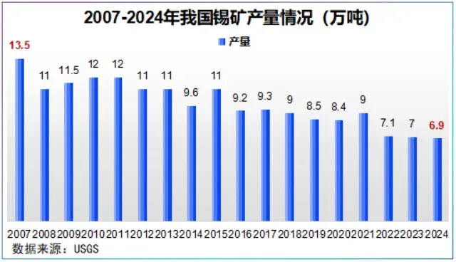 我国锡矿产量从2007年高点13.5万吨降至20246.9万吨。同时我国锡矿储量也呈下降趋势,从2000年的350万吨高点降至2024年的100万吨。