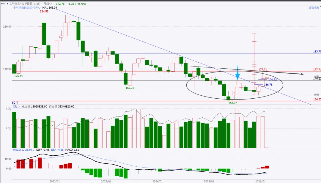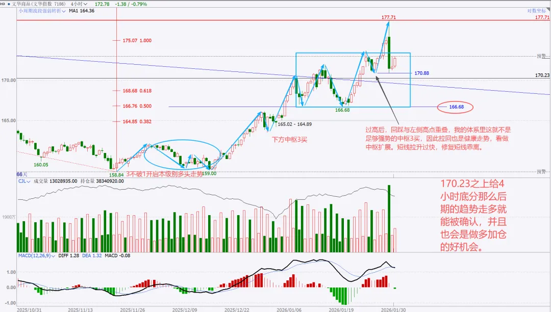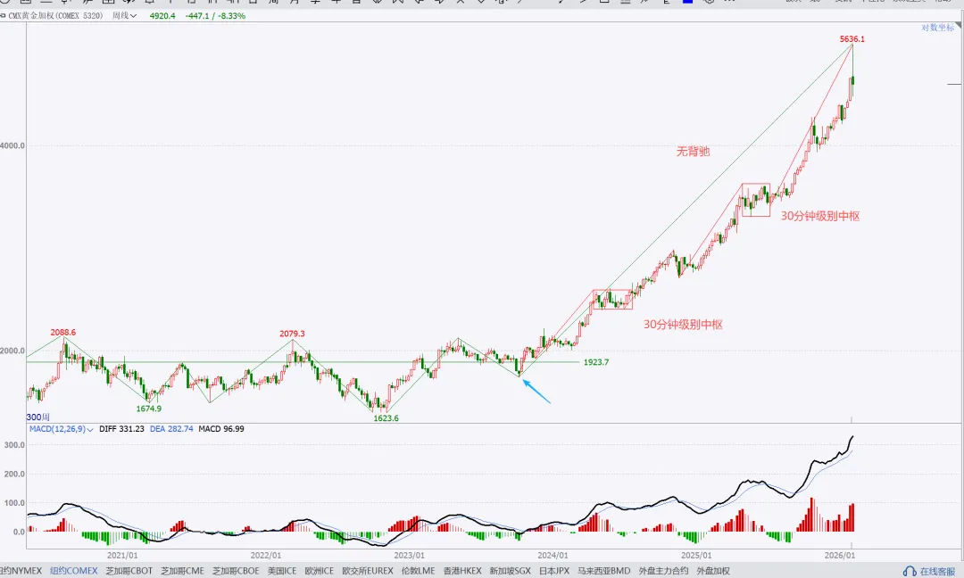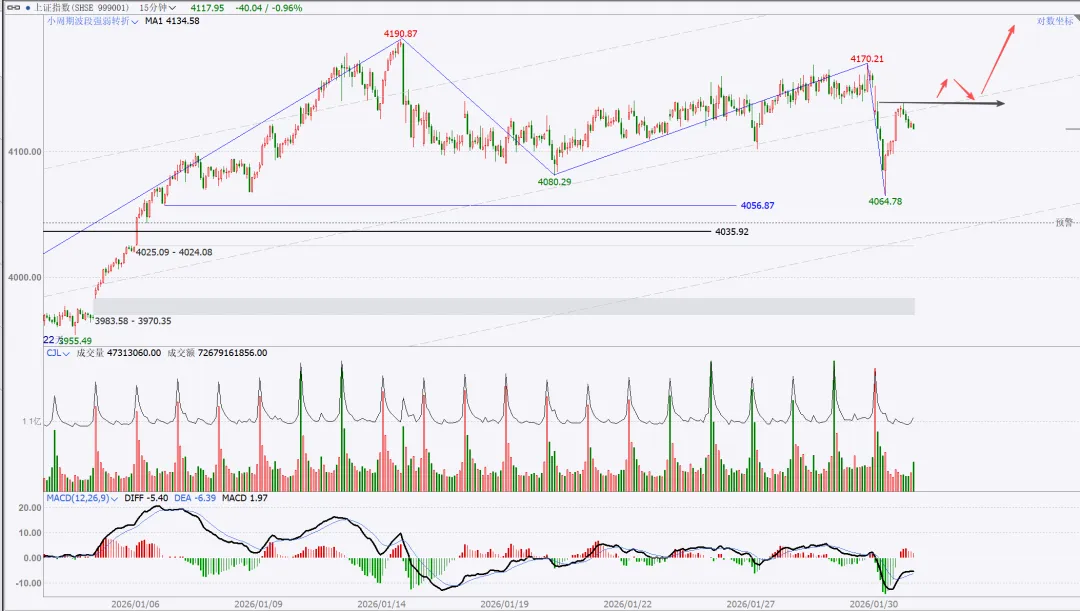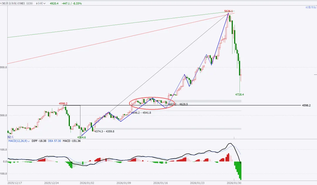 上周提示的风暴,结果出现在后半周,不过不影响,该来的始终都会来,刚好也收月线了,月度与周度复盘就二合一。没太多需要讲的,收盘站上,量价配合,月线看,向上走势延续。周五是一个低开,大幅下探回升的纺锤线,代表市场分歧,多空均衡状态。这里如果给日线底分,那么就要往上高看到4500了。如果没有底分,暂时就管住手,多看少动。15分钟转强,就一定是站上黑色箭头后回踩确认,那么真正的红包行情就开启了。总结:本周股市很乏味,没有集中的热点主题,轮动也乱七八糟不连贯。短线依然看做无序振荡。重点个股还是各自梳理结构。周五在黄金白银巨幅波动的干扰下,市场的眼球都被吸引,忽略了美股市场的走势,哪怕最强标普创高,也明显给出了短期高点的右侧确认,周五亚洲盘夜盘,伴随川子提名新任FED主席后,市场更是加速踩踏。站在大漂亮角度,川子的布局的剧本:鲍威尔继续当鹰牌,维持不降息,美元短线反弹(同时让日元缓口气),美国政府再次陷入短期停摆阶段,美股因为避险预期进入短线修正(凯文沃什根据他以外观点市场认为他是小鹰派,实用货币主义,“降息+缩表”)我持保留意见,毕竟好岳父是川子的老铁。听其言观其行,后者更重要。模型思维在任何时候都是大忌,万事万物都是生长变化的,刻舟求剑不可取,有时候“想得很美”实际上根本无法落地。我们且走且看。策略上,我还是建议不超六成,且做好防守。只要大结构不被破坏,我最保守的观点最少4500。非常清晰从图上看到,月线收盘是收在分型+验证分型的高高点之上,是有效突破。小双底是已经明确了。文华指数4小时周期图:短线调整,中线等等买点机会。本次波段拉升内部本级别走势如图所示蓝箭头部分,非常清楚,趋势上,背驰,开启拉回,在最近中枢进行走势升级的调整。耐心等等调整结束后的买入机会。PX05合约周线图:中期看多,不追涨,看好支撑回踩低多。周线看结构非常清楚,下方日线级别中枢突破后,回踩确认,大3买点。只要这个点位没被有效跌破,下方的盘整上走势就看延续。这只周五下午盘后的截图分析,就看当前这里是次级别一笔回踩,还是本级别的一笔回踩。这是周五夜盘后的截图,如果只是次级别的一笔下,7354这里就不会被跌破,而后面根据走势生长,要调整到与大级别方向一致,就一定要走出次级别再次转多的确定信号。总结:整体思路,中期在7086大买点之上维持低多观点,不追涨,短线背靠7310小止损,低多建仓。其余品种在周五都有一定幅度拉回,参考px的分析就行,记住一点,背靠大级别的买卖点进行操作,胜率更高。这是一个非常清晰的长期大多头走势结构,季线大中枢突破后,回踩完成大3买确认。2016年开启本轮上升,两个周线级别中枢,形成趋势上行走势,如图标注无背驰。蓝箭头开启本轮往上走势,按照级别划分,再次走出两个同级别中枢,形成30分钟级别趋势往上走势,且无背驰。聚焦30分钟级别离开段内部,可以看到黑色中枢进入段与离开段形成了盘背。那么这个拉回就是针对这个背驰开启的快速修正。每一段蓝色线都是代表一个1分钟级别走势,1分钟级别走势之间也是没有背驰的,因此当前的拉回,针对的就是上图黑色部分即5分钟级别盘背一个快速修正。如果4596.2没有被刺破,就是一个中枢3买;刺破,则看做中枢扩展。从当前技术面分析,我是看不出来黄金任何转空信号,站在周线角度看,两条路径做不测而测:要么就是开启周线横盘震荡整理,做第三个中枢,持续时间较长,以年为单位,前两个都分别走了两年;或者是接下来慢慢修复短线的急杀,收复这根周线纺锤线,接着再创高点,形成大级别背驰后,见到真正的阶段性高点。在极强的牛市走势里,缓涨急跌是多见的,而我个人也更倾向后者。投资视角的建议,不追涨,哪怕是实物现货也不在当前的位置进行买入操作。非实物的话,更不建议碰。做个旁观者,进行跟踪观察分析足够了。以上就是本次的复盘内容,仅代表个人立场与观点,不具备任何投资依据。理查德丹尼斯